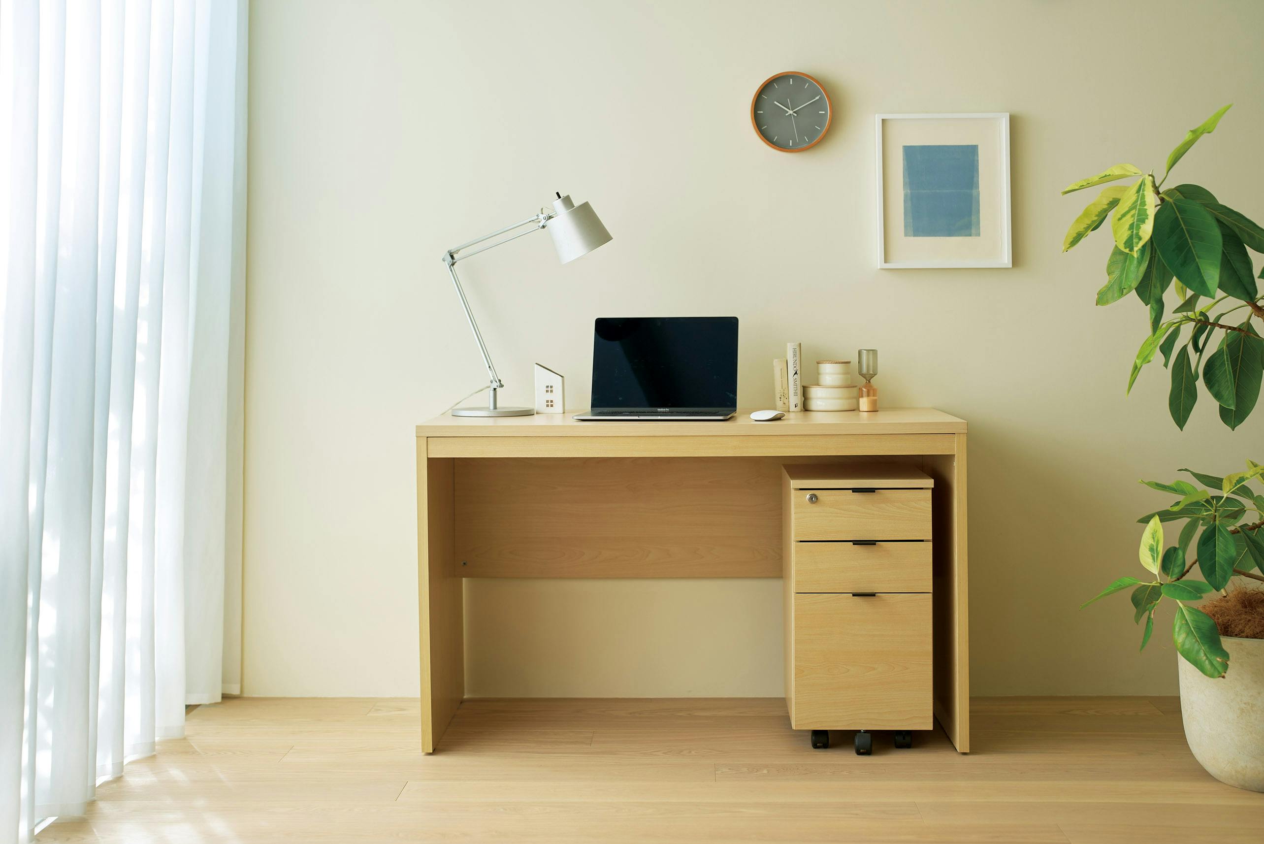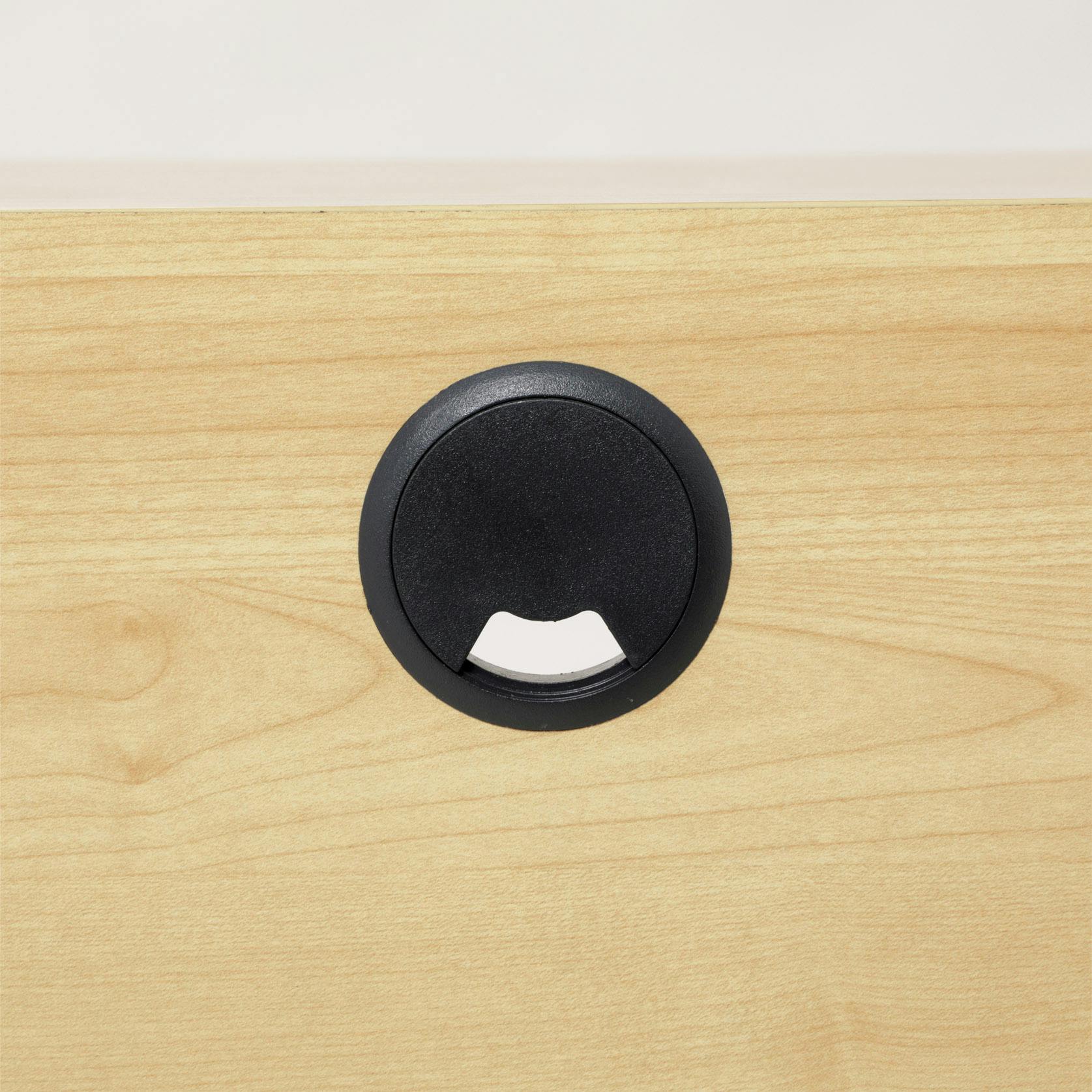 ・パネル脚がデスク周りをスッキリ見せてくれる定番デスク。天板にコードホールが開いておりパソコンの配線なども配しやすいよう設計されています。天板には傷や汚れに強いメラミン化粧板を使用しているので気兼ねなく使用出来ます。