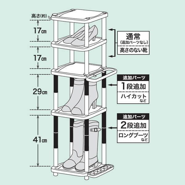 大人気玄関収納アイテム「くつ置けるん棚」専用の追加パーツです。本体に付けると棚の高さ17cmが29cmにアップし、ハイカットシューズ等が置けるようになります。更にもう1セット使えば高さが41cmにアップ。ロングブーツや長靴等も収納できます。こちらのパーツを利用することで収納できる靴のレパートリーが更に増えます。
