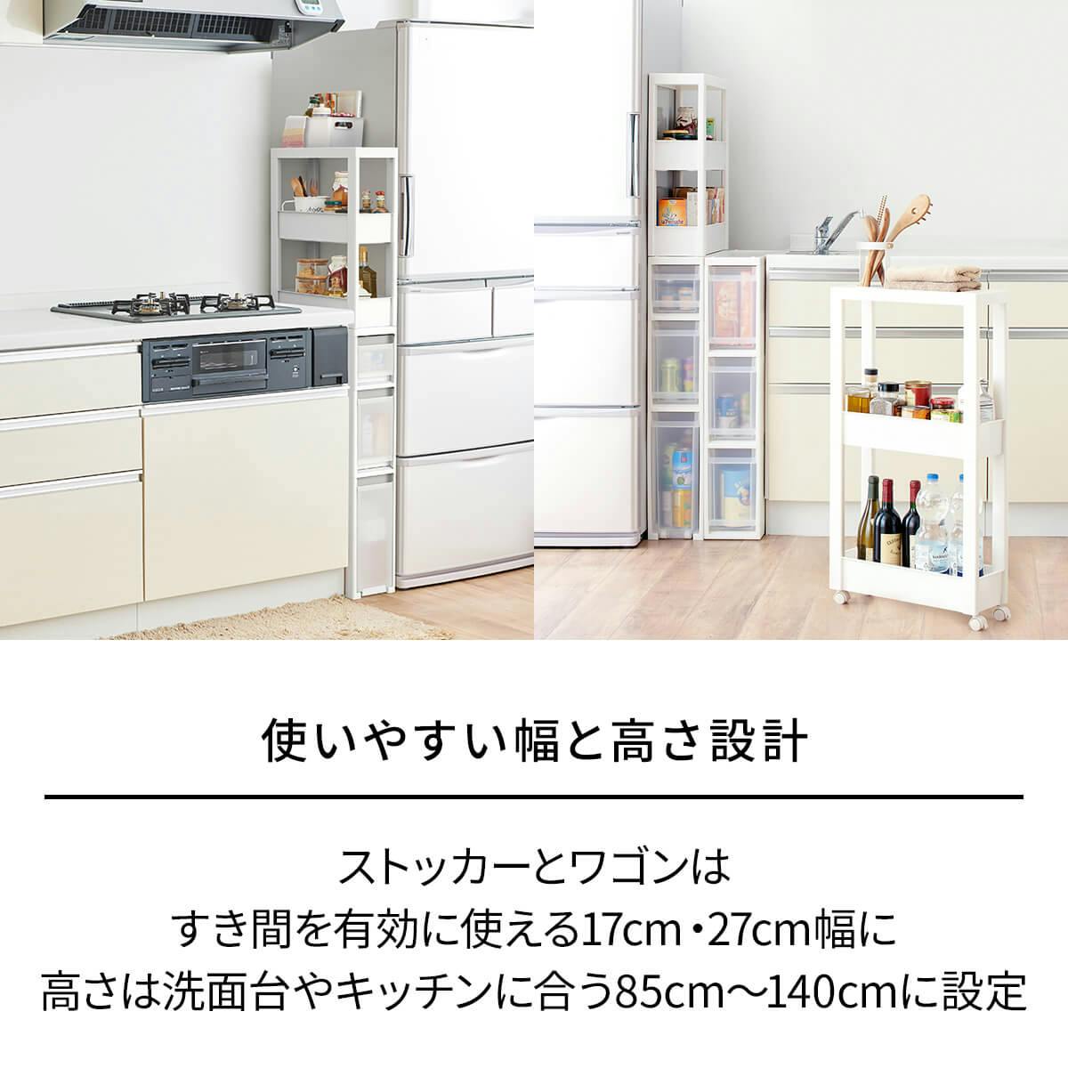 明るいホワイトカラーですっきり度UP!さらにコーディネートしやすくなった『スキピタ』シリーズが登場♪デッドスペースを有効活用できるすき間収納ストッカーです。幅17cmのスリムタイプ。スタイリッシュなホワイトカラーで、キッチンや洗面所などあらゆるシーンでのストック収納におすすめです。