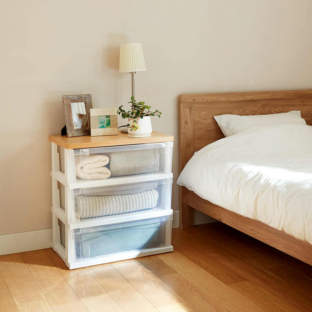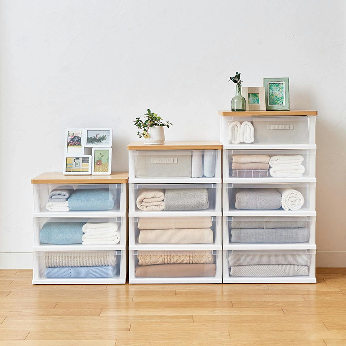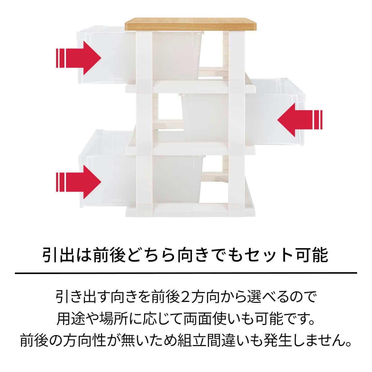 木製天板付きのシンプルな多段収納ケースです。ナチュラルなデザインで、どんなお部屋にもなじみます。引出しストッパー付きで安心してお使いいただけます。組立式なので、お求め安く、コンパクト梱包、工具不要で簡単に組立出来ます。