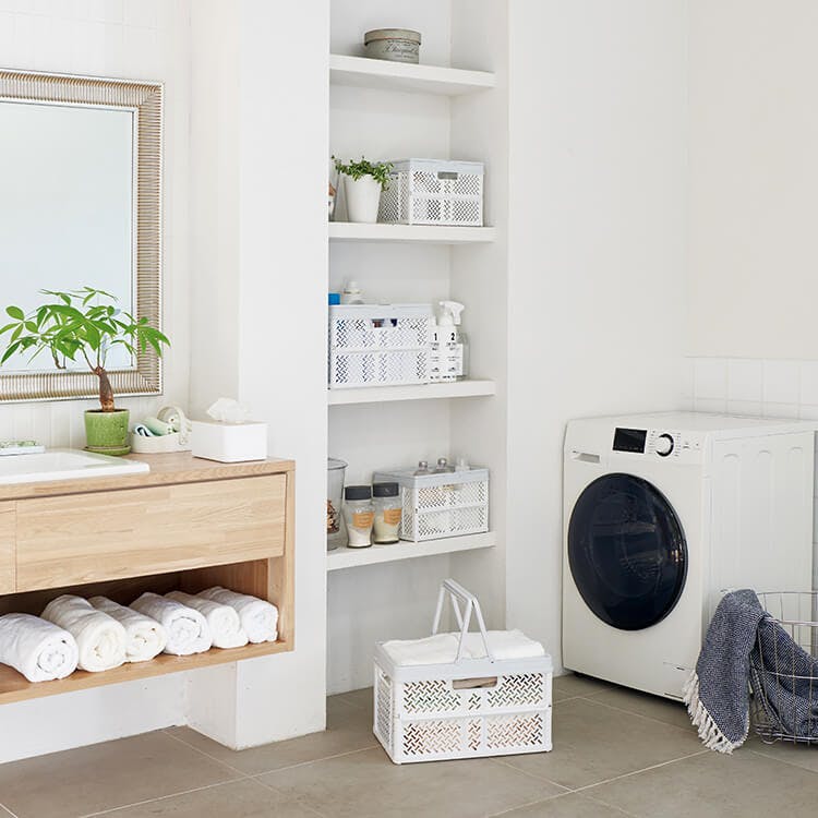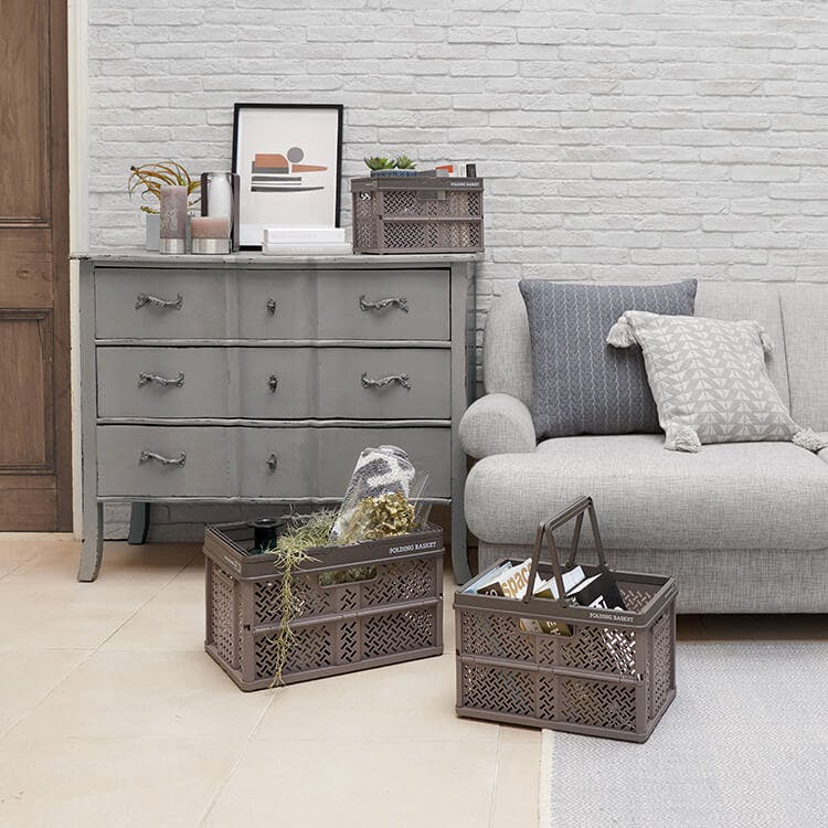 おしゃれなデザインのハンドル付きバスケットです。折りたためるので、使用しないときはコンパクトに畳むことができます。おもちゃや衣類、食料品の収納やレジャー時の荷物入れなど幅広くお使いいただけます。