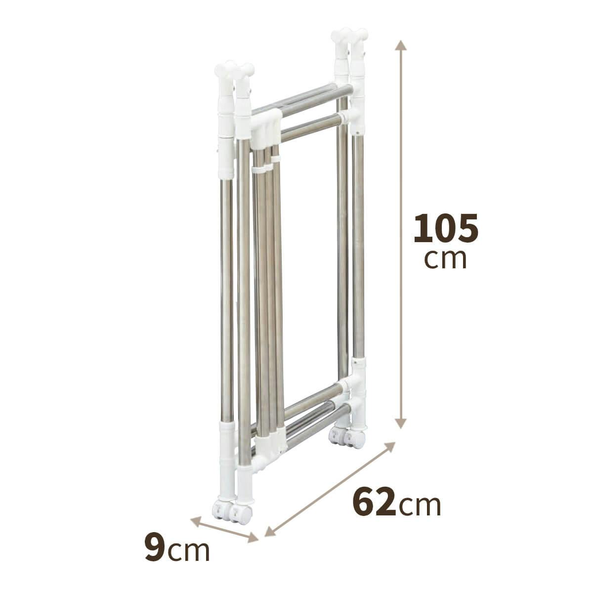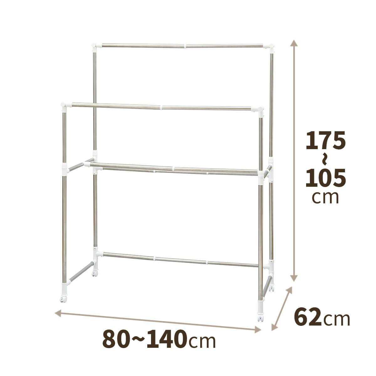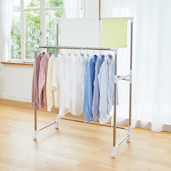 組み立てがいらない完成品の多機能物干しです。伸縮式の竿が3本付属しているのですぐに使えます。幅と高さのダブル伸縮もできます。