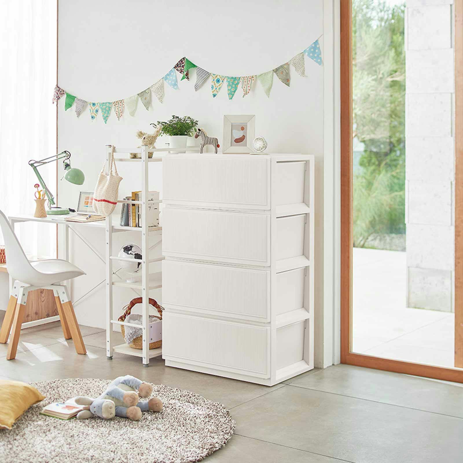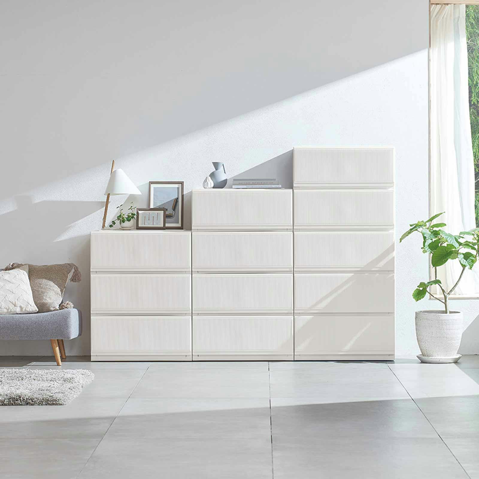 スムーズに開閉できる引出し、掃除がしやすい形状、簡易キャスター付きなど、快適にご使用いただける収納チェストです。組立ても工具不要で簡単。どんなインテリアにも馴染みやすいデザインにしました。