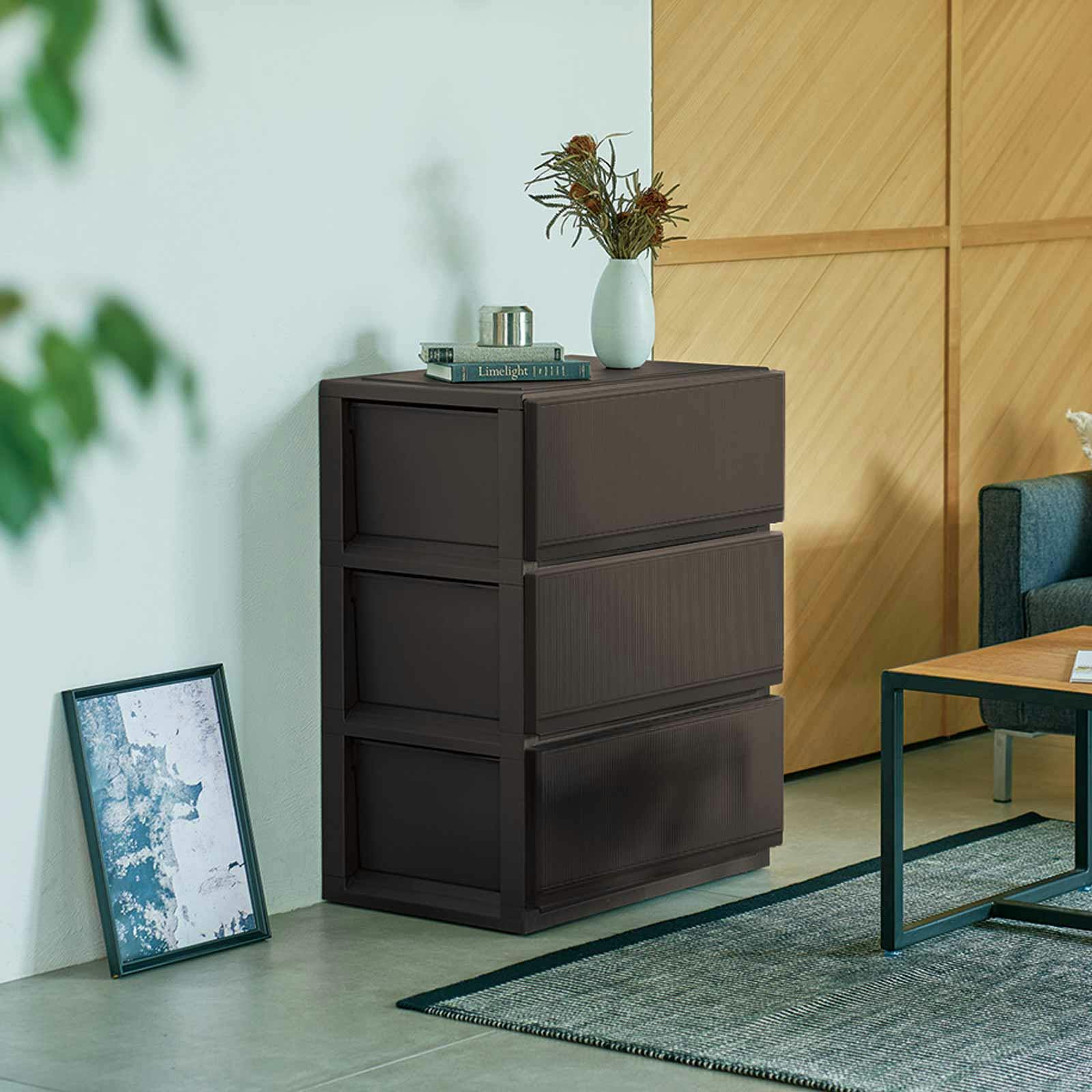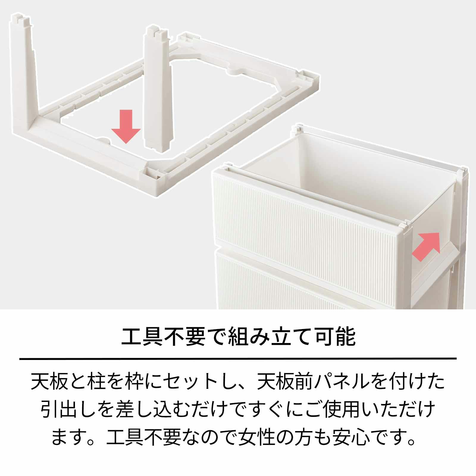 スムーズに開閉できる引出し、掃除がしやすい形状、簡易キャスター付きなど、快適にご使用いただける収納チェストです。組立ても工具不要で簡単。どんなインテリアにも馴染みやすいデザインにしました。