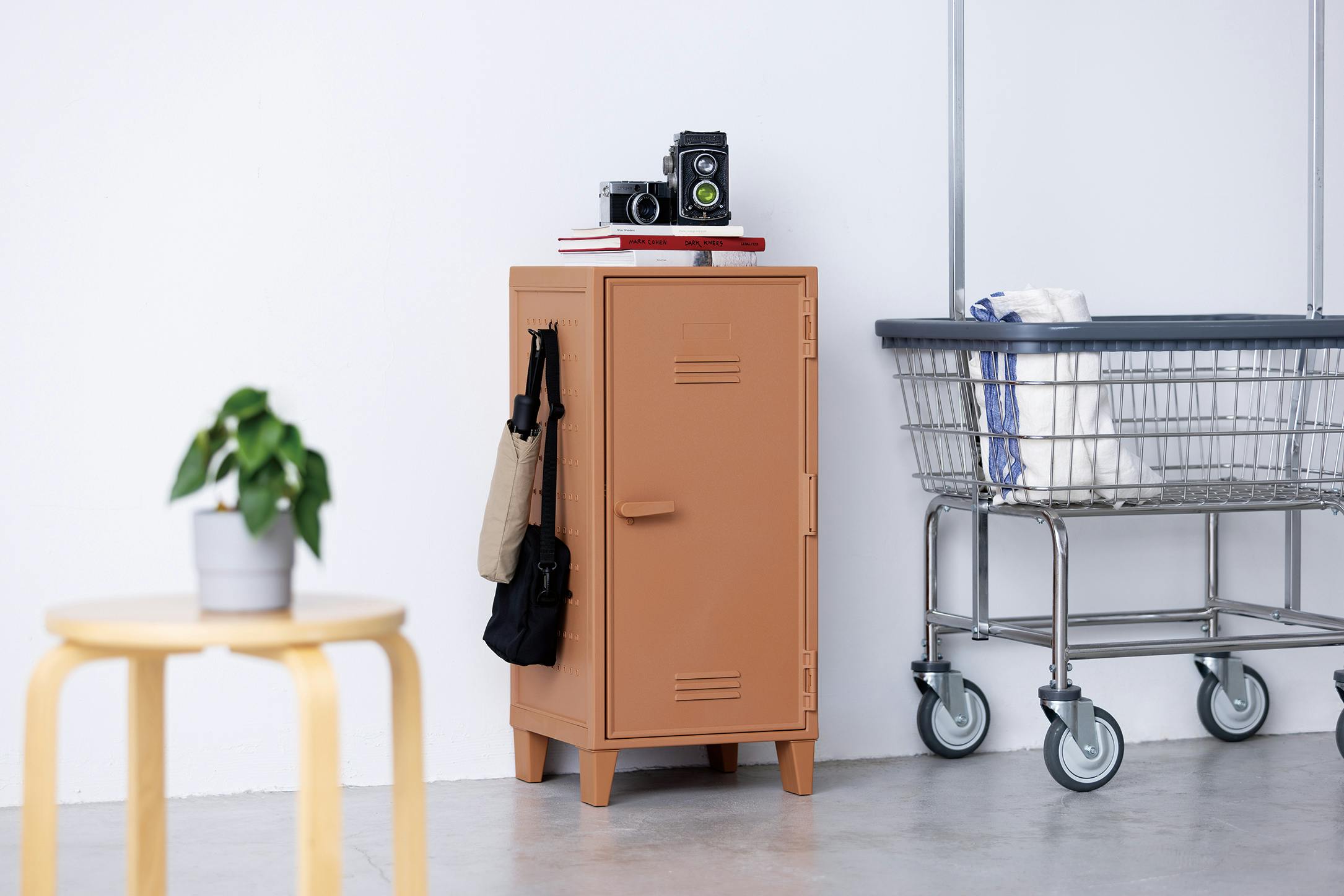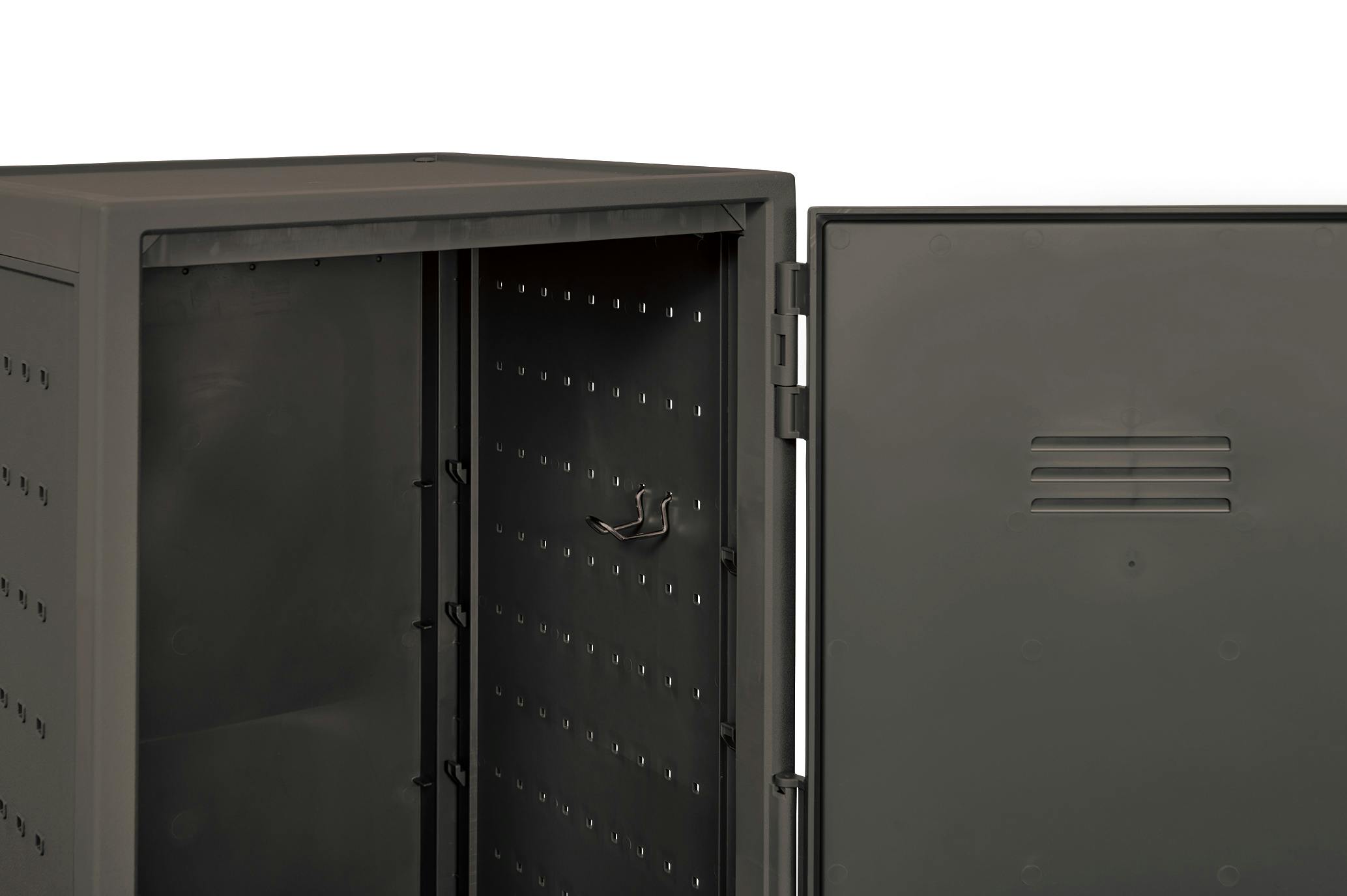 側面にペグボードが付いたプラスチック製のロッカー型収納ケースで、フックなどのペグボード部品を製品内外に取付けられるので、自由にアレンジできます。製品内にある棚の高さは4段階で調整可能です。