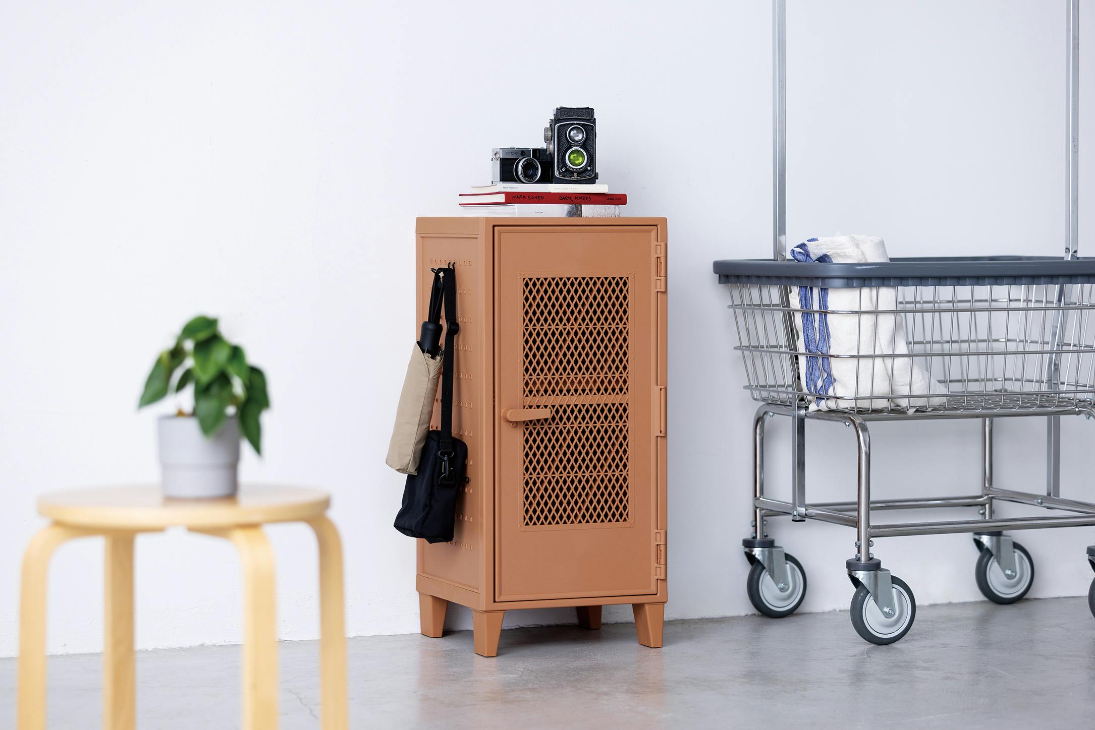側面にペグボードが付いたプラスチック製のロッカー型収納ケースで、フックなどのペグボード部品を製品内外に取付けられるので、自由にアレンジできます。製品内にある棚の高さは4段階で調整可能です。