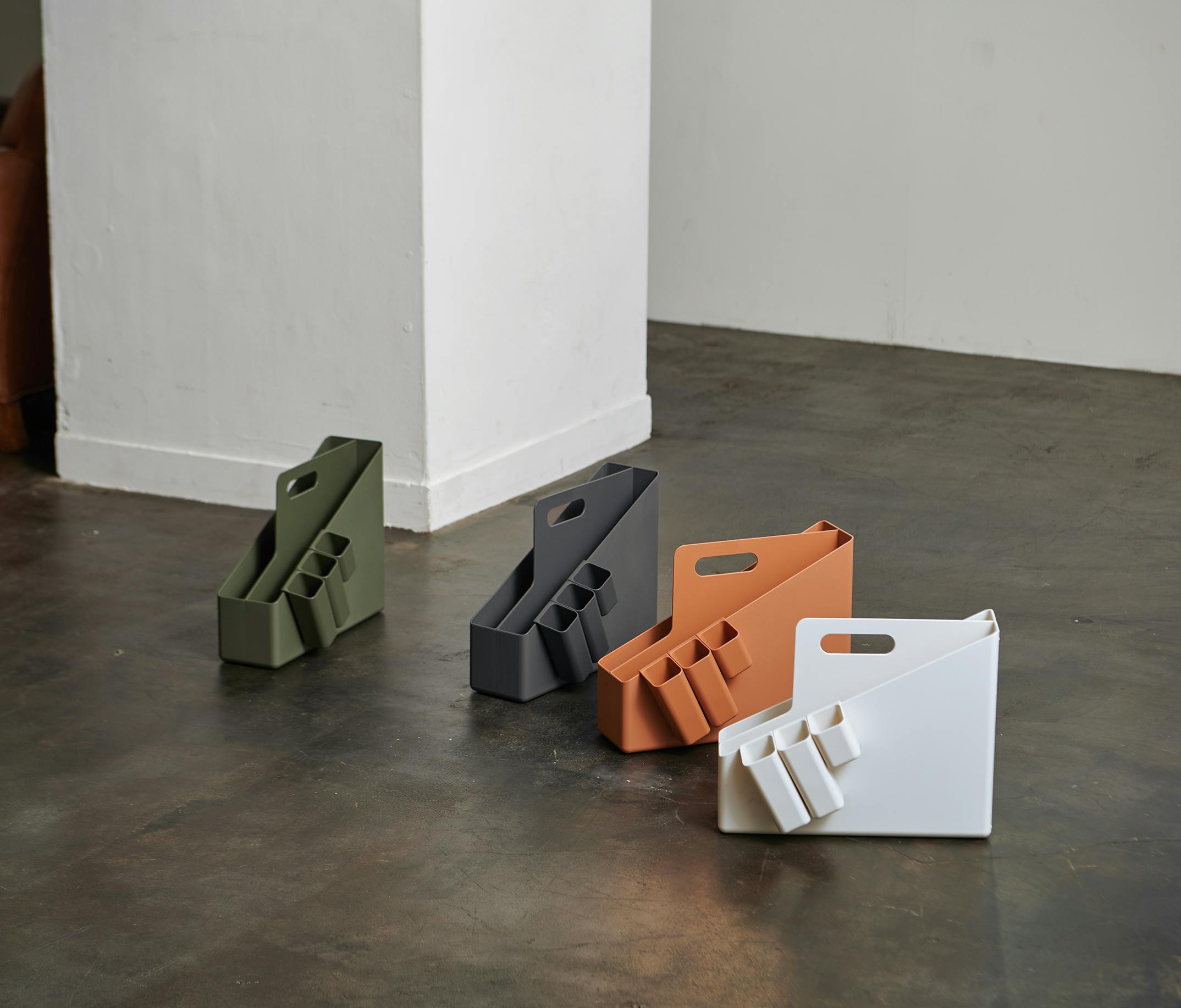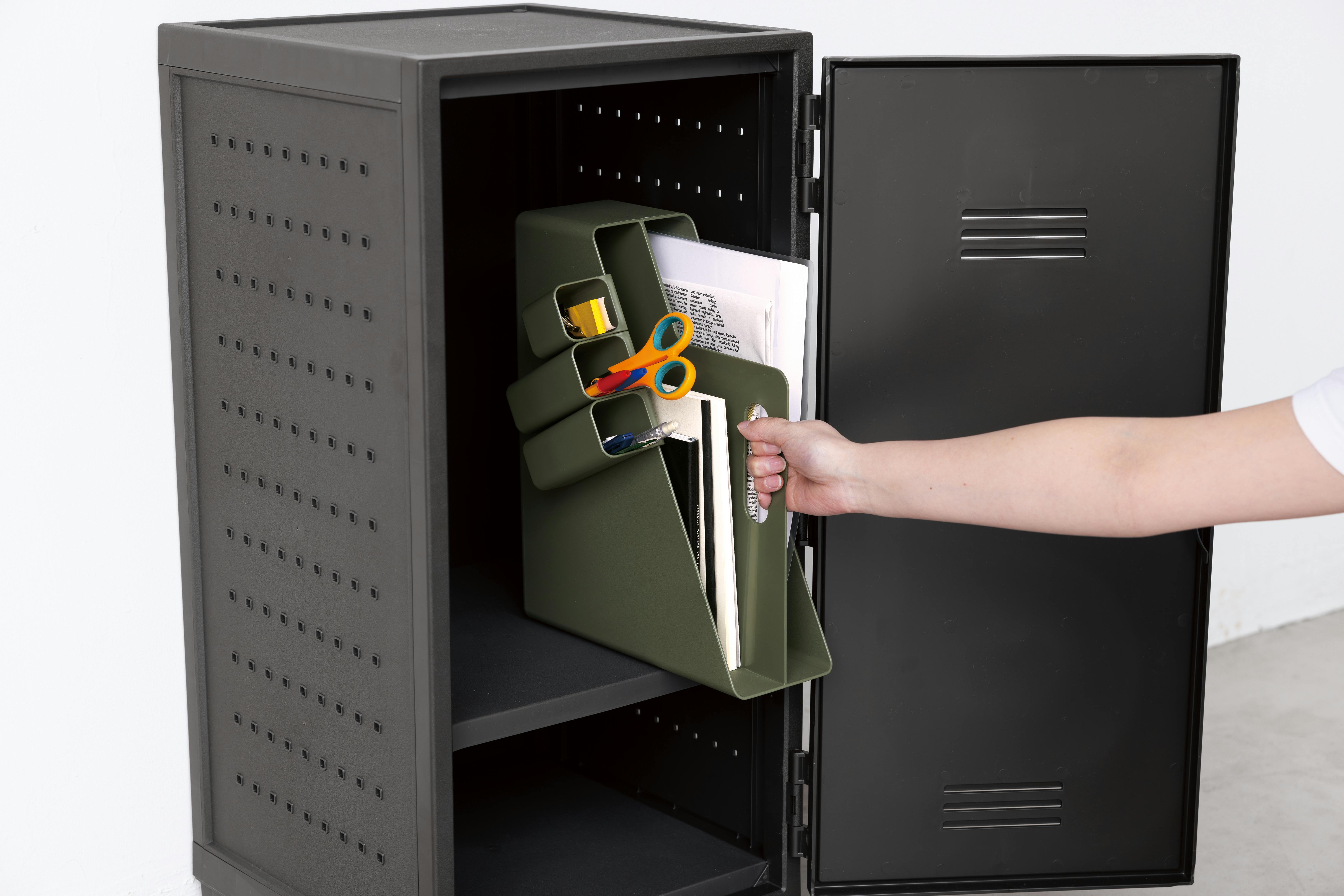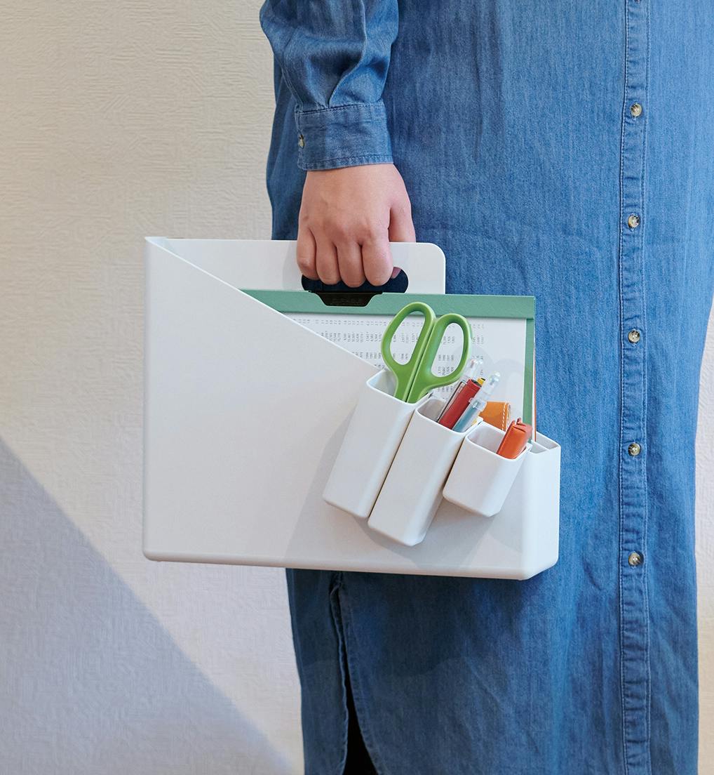 書類やデスク周り文具などを、ひとまとめにして持ち運びできる取っ手付きのファイルボックスで、横置きと縦置きの2種類の使用方法が可能なので用途によってお選びいただけます。