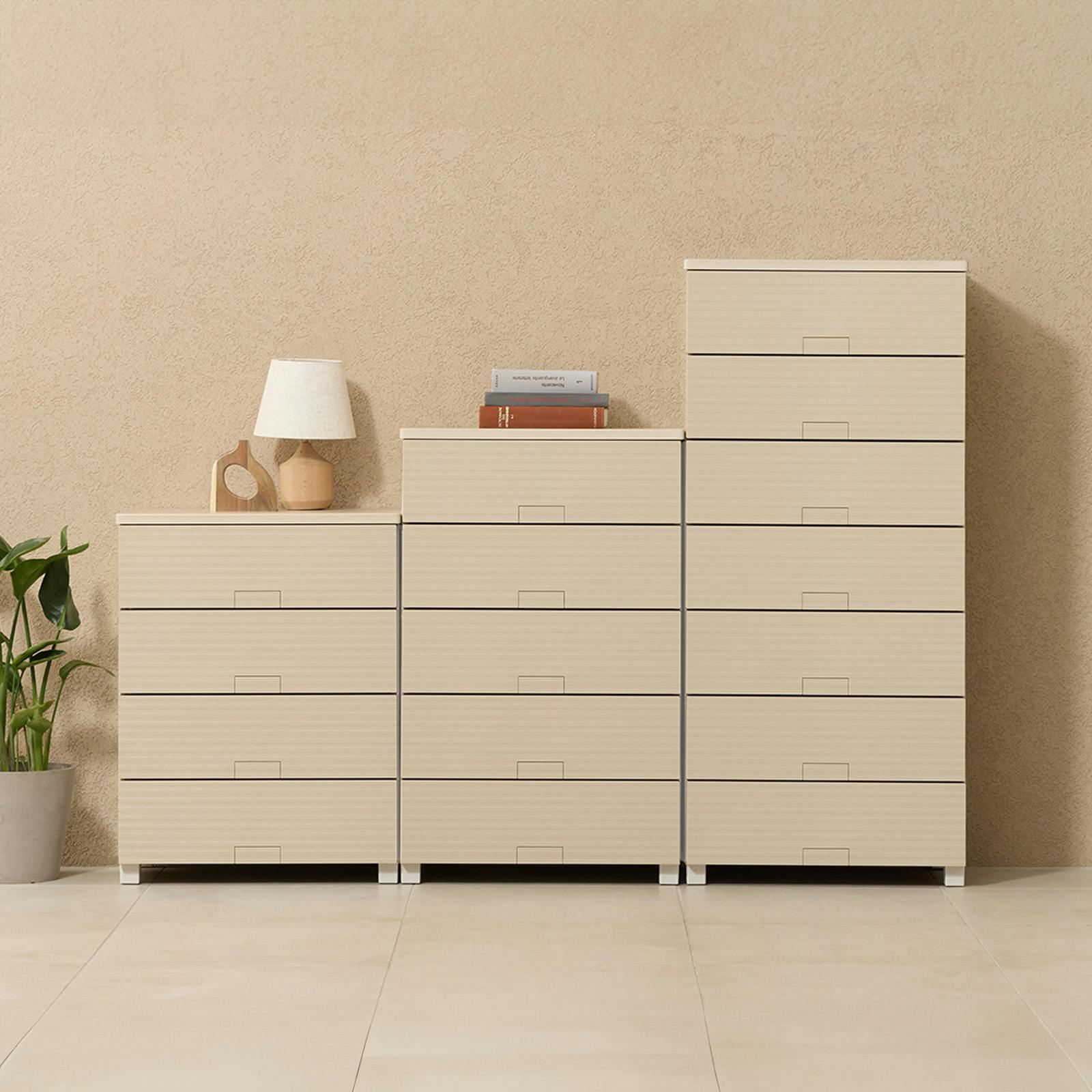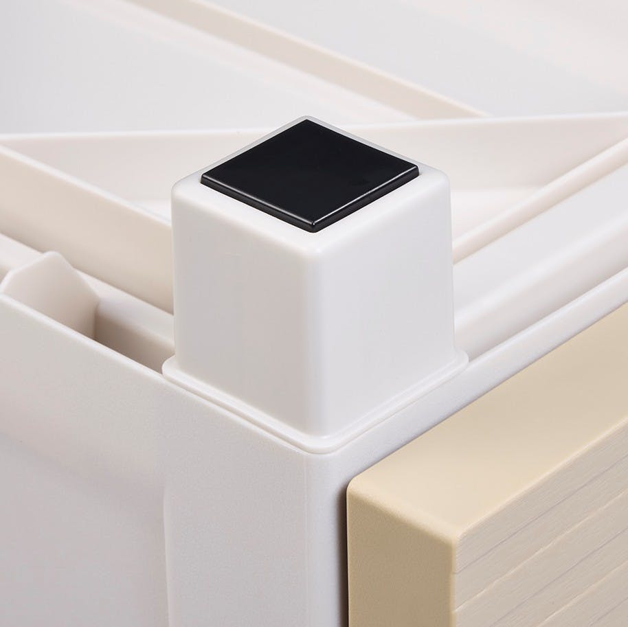 【引出し・外枠・ロック・脚】再生ポリプロピレン(再生材比率14%以上)【ローラー】ポリプロピレン【すべり止め】ポリエチレン【前パネル】スチロール樹脂【天板】プリント化粧木質繊維板