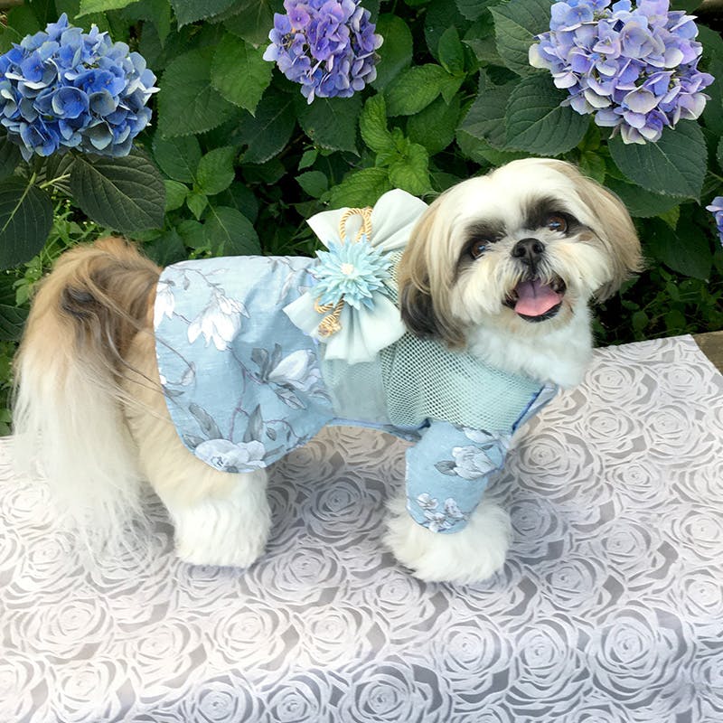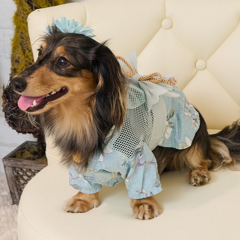 背中のお花は取り外し可能。ヘアピン仕様で、取り外して頭などにつけても可愛いです。毛に付きにくいマジックテープで、着せるときも安心。空調ペット服 COOLDOG?のペットファン付もございます。