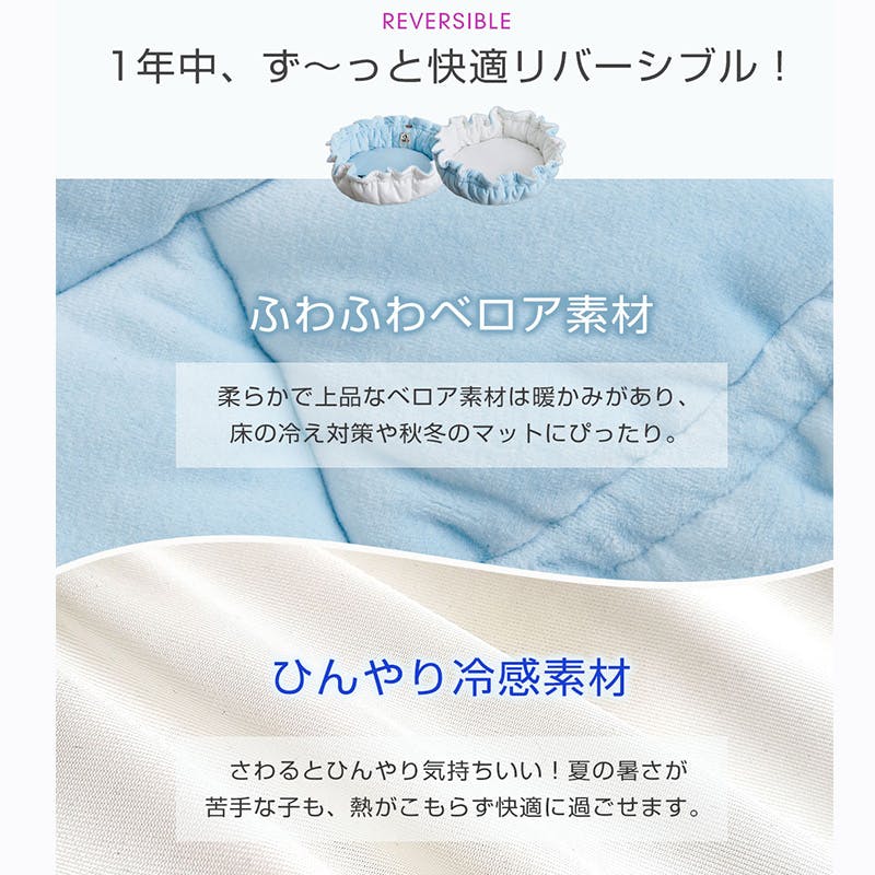 マカロンみたいな可愛いデザインの2WAYクッションです。縁を絞って、お昼寝マットにも、包み込まれるようなおやすみベッドにもなる2WAYスタイル。しかも!リバーシブルで1年中快適。秋冬は滑らかなベロア素材であったか、 春夏はさらさら接触冷感素材でひんやり。