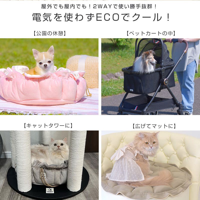 マカロンみたいな可愛いデザインの2WAYクッションです。縁を絞って、お昼寝マットにも、包み込まれるようなおやすみベッドにもなる2WAYスタイル。しかもリバーシブルで1年中快適、秋冬は滑らかなベロア素材であったか、 春夏はさらさら接触冷感素材でひんやり。さらにポケットに吸熱放熱保冷ジェルを入れれば、さらにひんやりが続きます。