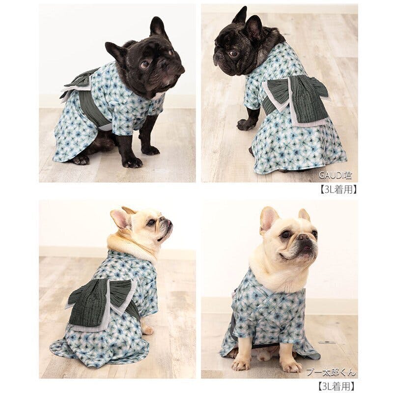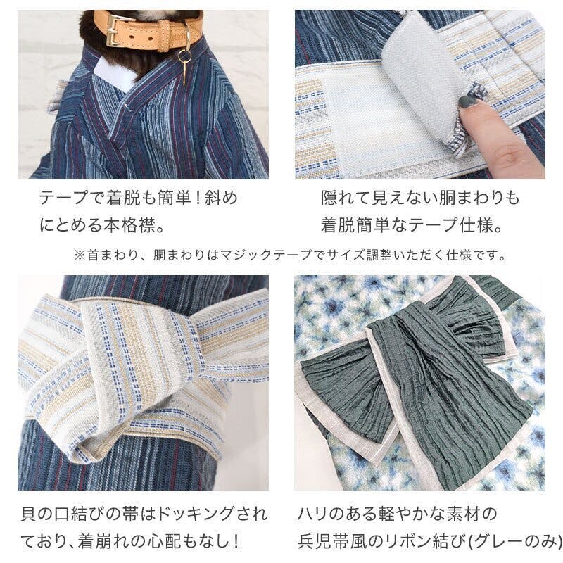 涼しげで上質な生地に日本の伝統的なフラワーアレンジメントにインスパイアされた英国デザイナー描き下ろした美しい柄をプリント。 帯も昨今人気の兵児帯風の縫い付け帯で、他にはないワンランク上のペット専用浴衣。 前襟は斜めにとめる仕様で、本格浴衣を忠実に再現。