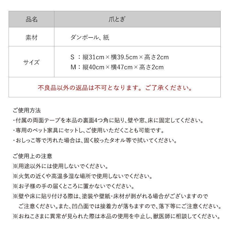 ※用途以外には使用しないでください。※火気の近くや高温多湿な場所で使用しないでください。※お子様の手の届くところに置かないでください。※壁や床に貼り付ける際は、塗装や壁紙・床材が剥がれる場合がございますのでご注意ください。 また、凹凸面では接着力が落ちますので、落下等にご注意ください。※おねこさまに異常が見られた際は本品の使用を中止し、獣医師に相談してください。
