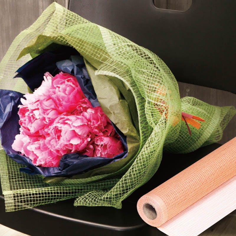 粗目のメッシュ状のレーヨンシートです。かための樹脂加工でほつれを防止しました。ナチュラルなフラワーラッピングにぴったりです。