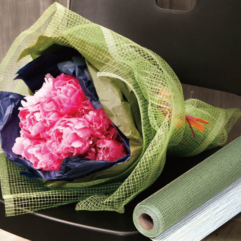 粗目のメッシュ状のレーヨンシートです。かための樹脂加工でほつれを防止しました。ナチュラルなフラワーラッピングにぴったりです。