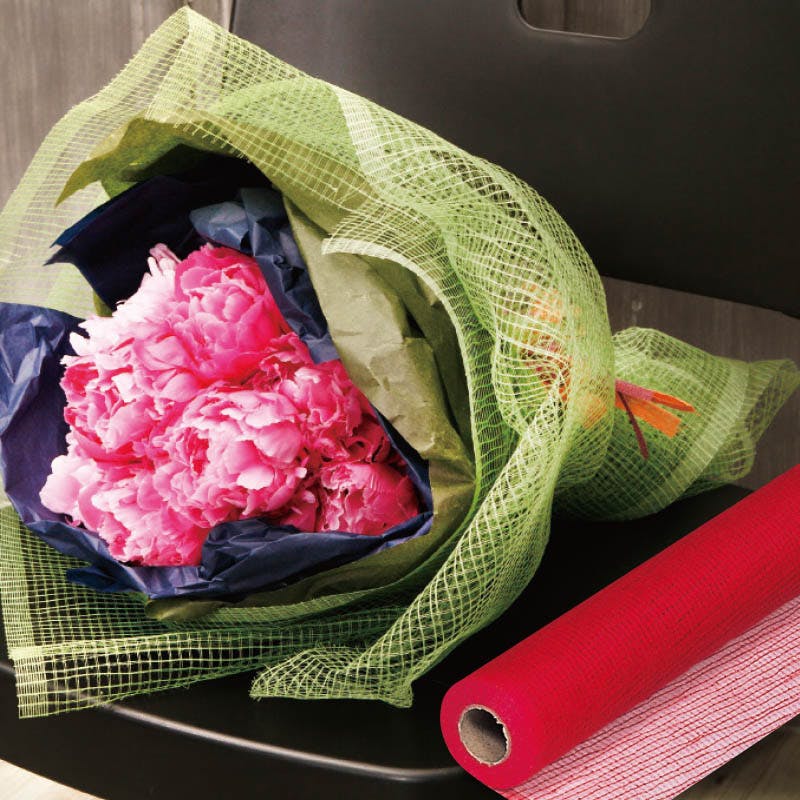 粗目のメッシュ状のレーヨンシートです。かための樹脂加工でほつれを防止しました。ナチュラルなフラワーラッピングにぴったりです。