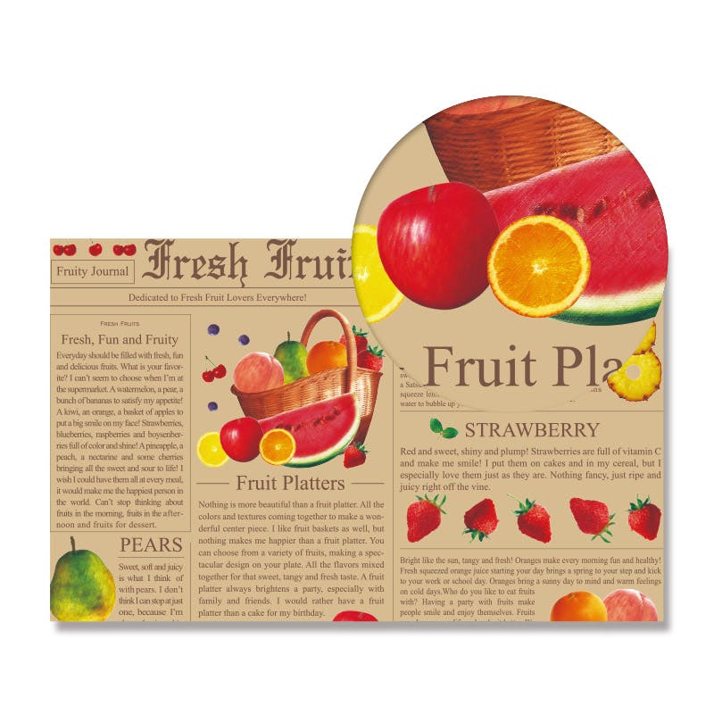 人気の英字新聞風柄にも色鮮やかなフルーツをあしらいました。ちょっとしたギフトにも、雑貨にも使えるデザインです。