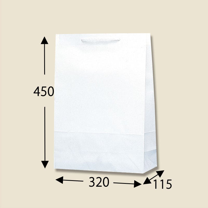 袋本体の穴に通した手紐を結んで取り付けたタイプの手提げ紙袋です。口を内側に折り返し、ボール紙を挟んで強度を持たせています。縦長のスタンダードサイズで、A3縦対応。汎用性の高い白無地。●手紐:PP紐白●入数:50枚