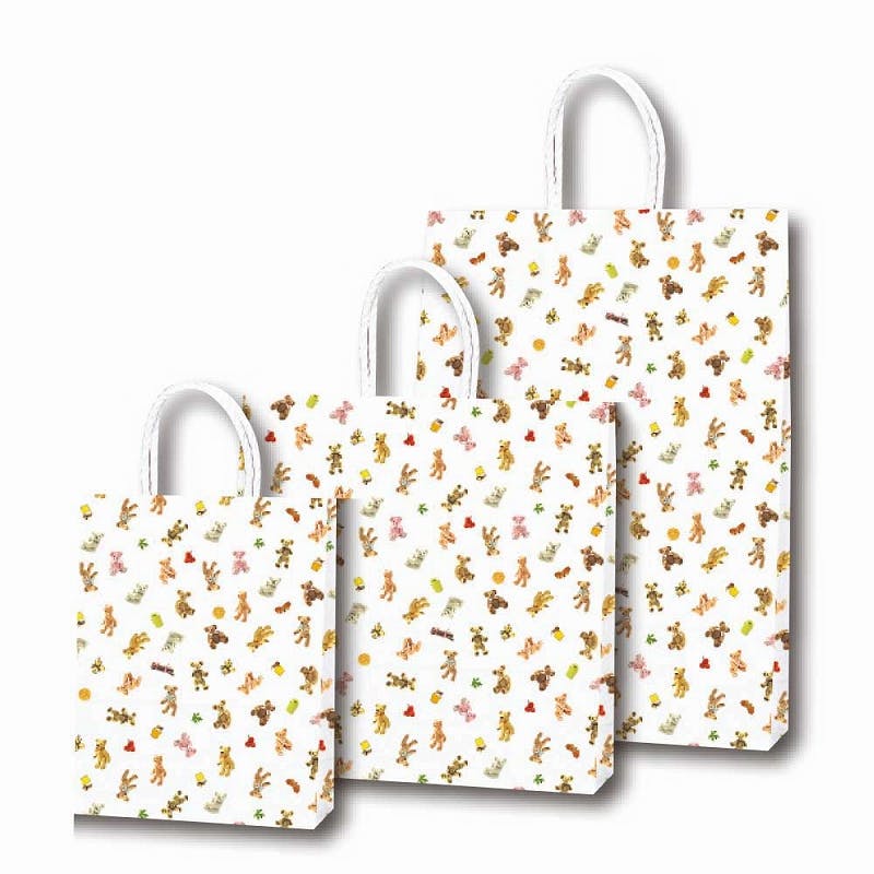 樹脂製の接着剤で手紐を取り付けた手提げ紙袋です。紐の結び目がなくすっきりし、物の出し入れがスムースで、ストックする際にかさばらないメリットがあります。正面の見た目が正方形のオールマイティモデル。キュートな熊さんを散りばめたデザインで、お子様向けの用途に向いています。●手紐:丸紐白3本撚り●入数:25枚