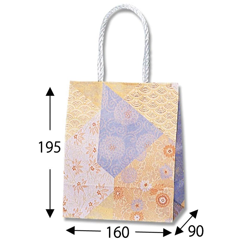 樹脂製の接着剤で手紐を取り付けた手提げ紙袋です。紐の結び目がなくすっきりし、物の出し入れがスムースで、ストックする際にかさばらないメリットがあります。コンパクトな人気サイズで、小物雑貨やちょっとしたギフトに。昔から伝わる和柄の生地をつなぎ合わせたイメージのデザインです。●手紐:PP紐白●入数:25枚
