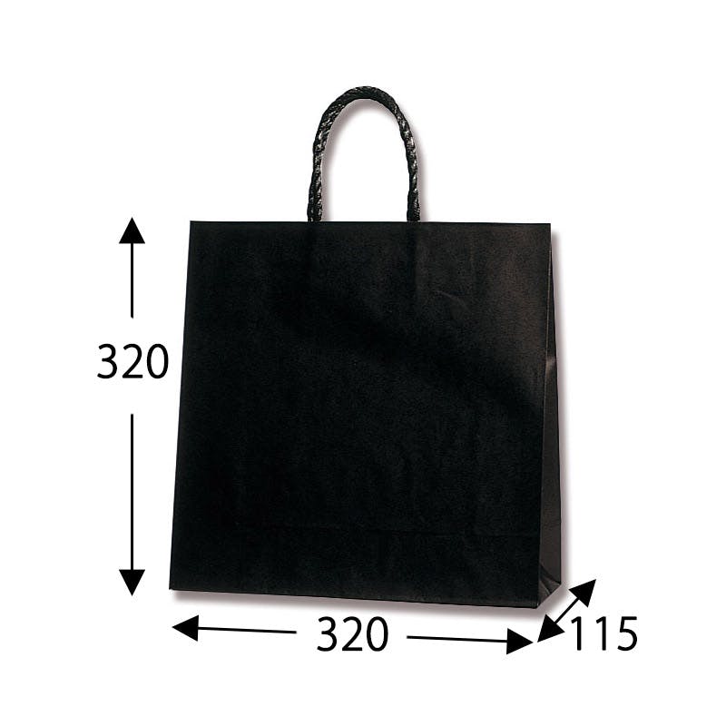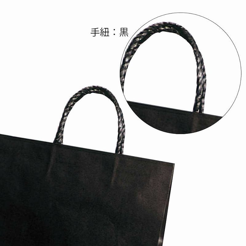 樹脂製の接着剤で手紐を取り付けた手提げ紙袋です。紐の結び目がなくすっきりし、物の出し入れがスムースで、ストックする際にかさばらないメリットがあります。正面の見た目が正方形のオールマイティモデル。シックな黒無地。●手紐:PP紐黒●入数:25枚