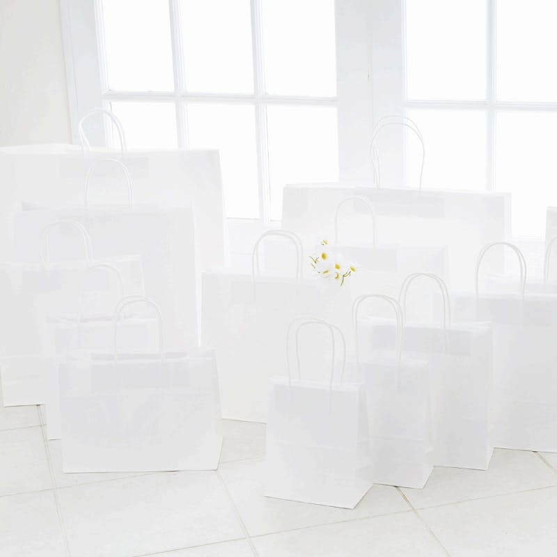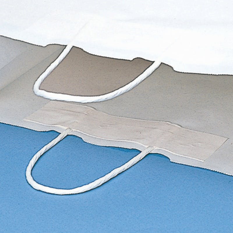 もっとも汎用性の高い、プレーンな白無地の手提げ袋です。縦型で、25チャームバッグの中でも丈が最大の大型定番サイズです。●手紐:丸紐白●入数:50枚