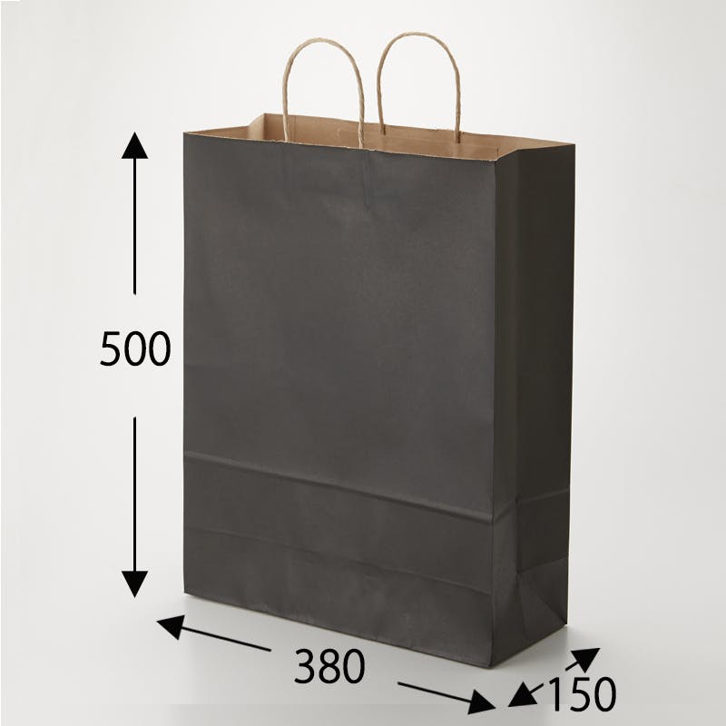 クラフト紙に黒ベタを印刷した手提げ紙袋です。色落ちを緩和させるために、上からニスを塗布しています。縦型で、25チャームバッグの中でも丈が最大の大型定番サイズです。●手紐:丸紐未晒●入数:50枚