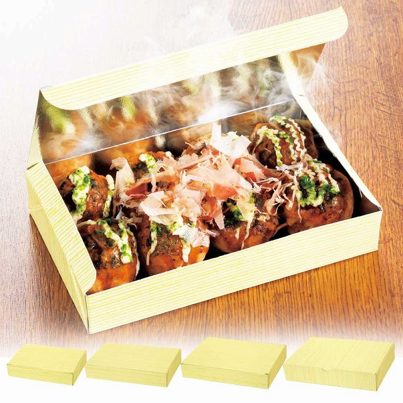 メタリック紙使用で保温効果が有り、赤飯やたこ焼き、お好み焼きなどの持ち帰りに最適