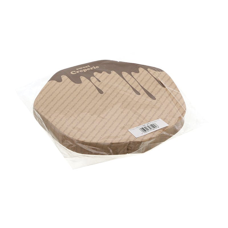 ラミ加工クレープ包装紙です。水分の多いクレープに最適です。切り口(へこみ)を目印に折り込み、折り目に合わせてクレープを置き、クレープに合わせて巻いて使用します。●入数:200枚