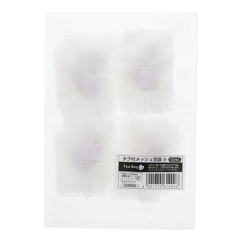お好みで濃さを調整できるタグ付きの空袋です。ティーバッグ用に。抽出性がよく、お茶の色目が楽しめるメッシュタイプ。ヒートシーラー対応です。●容量目安:2~3.5g●入数:100枚