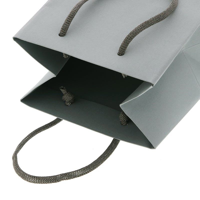 エンボスの入った自然で柔らかい風合いの特殊紙を使用した紙袋です。持ち手は一般的な石油由来のアクリル紐ではなく、柔らかく環境にやさしい紙紐を採用。紙製とは思えないしなやかさです。お店のイメージや、プレゼントするアイテムに合わせて選べるカラーバリエーションも魅力。●入数:5枚 ●手紐:紙紐(グレー)