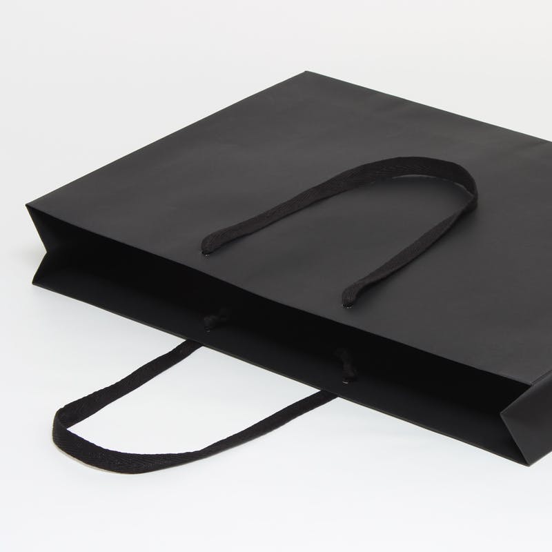 衣料品向けに幅を広く、マチを狭めにした袋です。肩から提げられる様に手紐を長めにしています。黒ベースで箔押しやシルク印刷が映えます。