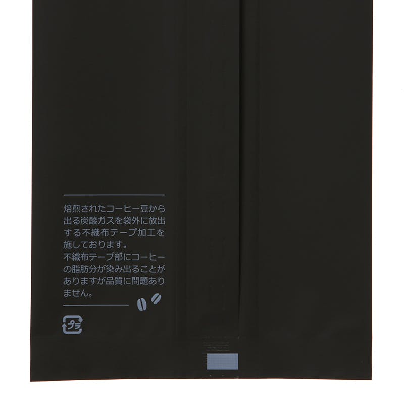 コーヒー豆専用の販売用袋です。袋の貼り合わせの不織布部分に出来たからすき間から、豆から出る炭酸ガスを外に排出します。シックなマット黒タイプです。内側アルミ加工で遮光性にも優れています。●合掌平袋タイプ●ヒートシール可●脱酸素剤・乾燥剤使用不可●短期保存向け推奨
