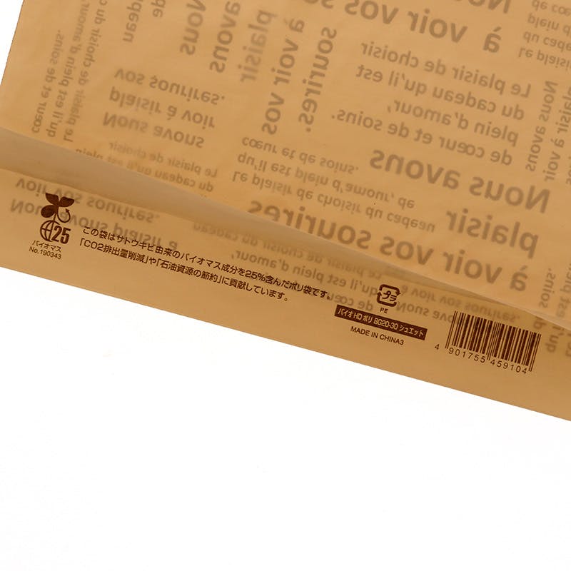 生物由来の有機資源を原料としたバイオマス成分を25%含んだ底マチ付の手抜きポリ袋です。ナチュラルでシンプルな仏語の落ち着きのあるデザイン。バイオマスマーク取得済みで、「プラスチック製買物袋有料化制度」の対象外とすることが可能です。主原料のサトウキビは、育成時に光合成をして大気中のCO2を吸収するため、石油化学由来の原料と比較すると大幅なCO2の削減に貢献します。