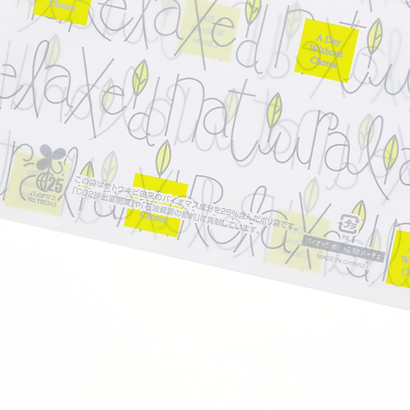 生物由来の有機資源を原料としたバイオマス成分を25%含んだ手抜きポリ袋です。ナチュラルとリラックスをテーマにしたスタイリッシュなデザイン。バイオマスマーク取得済みで、「プラスチック製買物袋有料化制度」の対象外とすることが可能です。主原料のサトウキビは、育成時に光合成をして大気中のCO2を吸収するため、石油化学由来の原料と比較すると大幅なCO2の削減に貢献します。※穴から下の高さは多少前後する場合があります。●入数:100枚●両面印刷