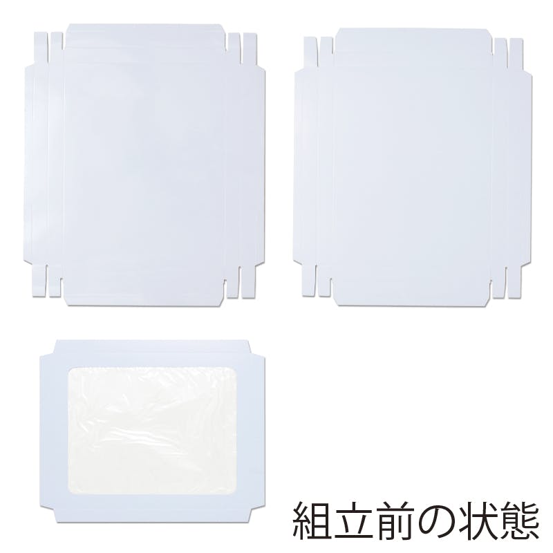 身・フタ・中枠の3種のパーツから組み立てる、フタをかぶせるタイプの白無地ボックスです。四方のサイドを折り込んで仕上げる組み立て式です。フタは表面に光沢を持たせ、中枠は透明フィルムが貼ってあり高級感があります。シーツなどに。10枚入り。