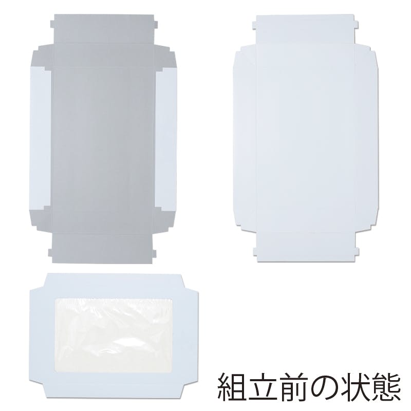 身・フタ・中枠の3種のパーツから組み立てる、フタをかぶせるタイプの白無地ボックスです。身・フタは側面を折り込むと自動的に箱状に立ち上がるワンタッチ式です。フタは表面に光沢を持たせ、中枠は透明フィルムが貼ってあり高級感があります。バスタオルなどに。10枚入り。