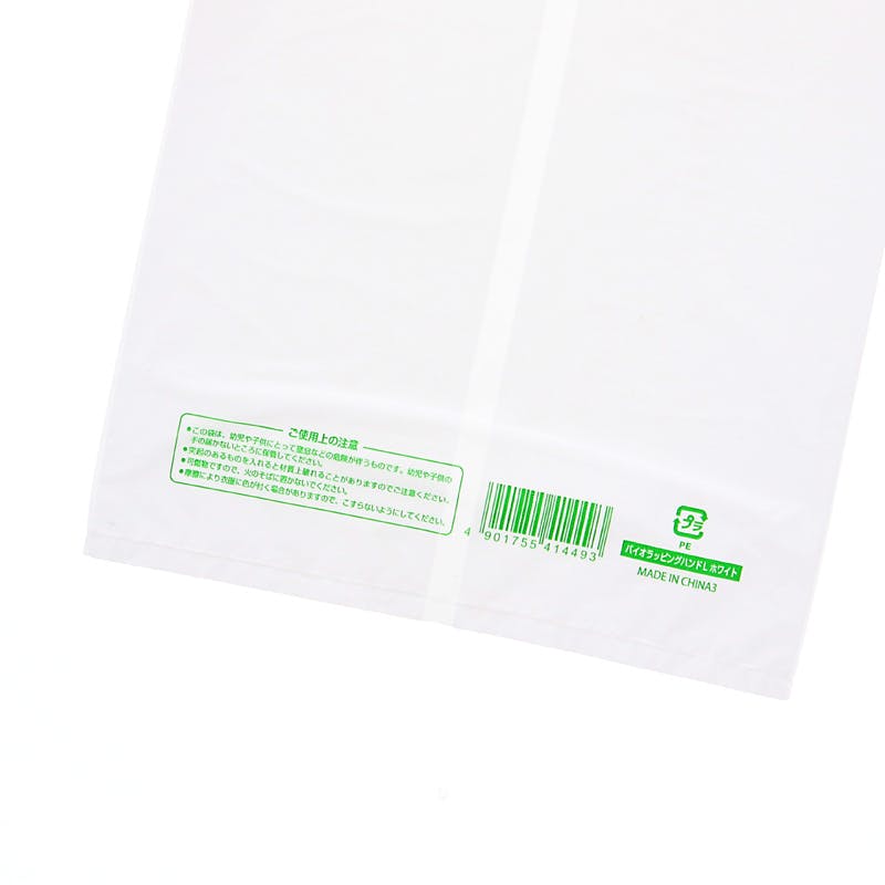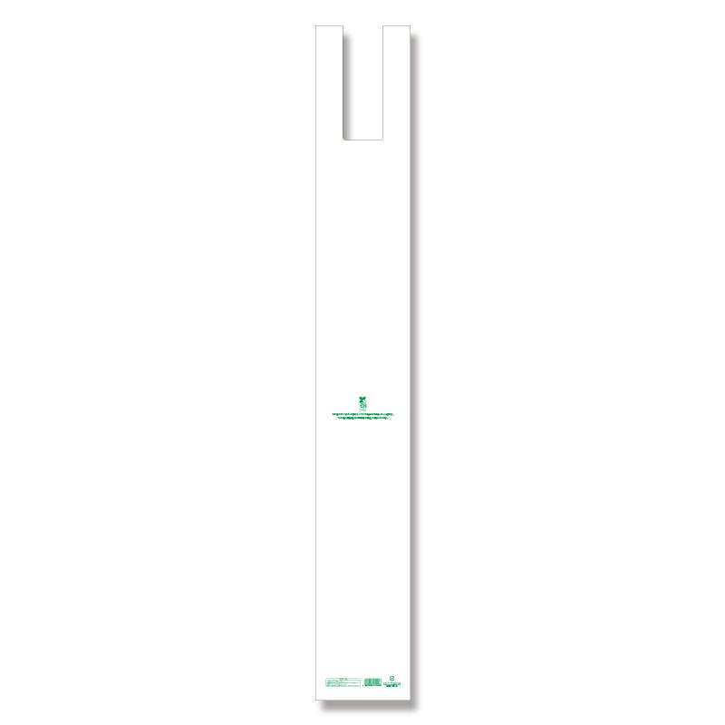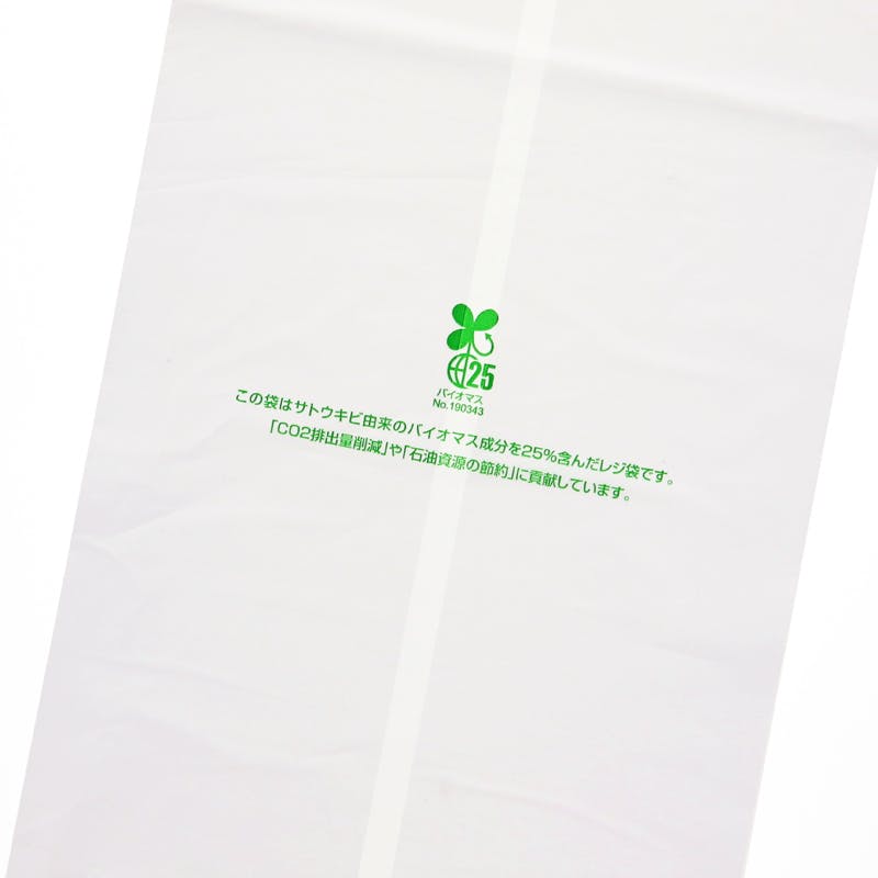 生物由来の有機資源を原料としたバイオマス成分を25%含んだレジ袋です。傘や巻いたポスター、棒状の商品など、細長い形状のお持ち帰りに最適。バイオマスマーク取得済みで、「プラスチック製買物袋有料化制度」の対象外とすることが可能です。主原料のサトウキビは、育成時に光合成をして大気中のCO2を吸収するため、石油化学由来の原料と比較すると大幅なCO2の削減に貢献します。買い物客に有償でお渡しすることも考慮し、本体1枚1枚にパッケージとは異なるJANコードを印字してあります。