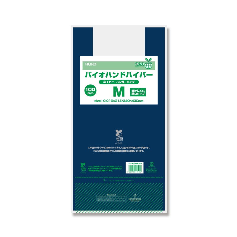 生物由来の有機資源を原料としたバイオマス成分を25%含んだレジ袋です。中身が透けにくい紺色。バイオマスマーク取得済みで、「プラスチック製買物袋有料化制度」の対象外とすることが可能です。主原料のサトウキビは、育成時に光合成をして大気中のCO2を吸収するため、石油化学由来の原料と比較すると大幅なCO2の削減に貢献します。東日本20号/西日本35号に準じた規格となりますが、サイズは若干異なりますのでご注意ください。●入数:100枚●ハンガータイプ●表面エンボス加工あり