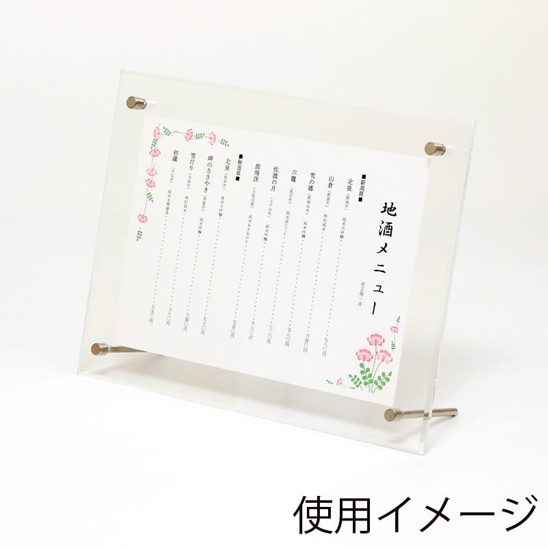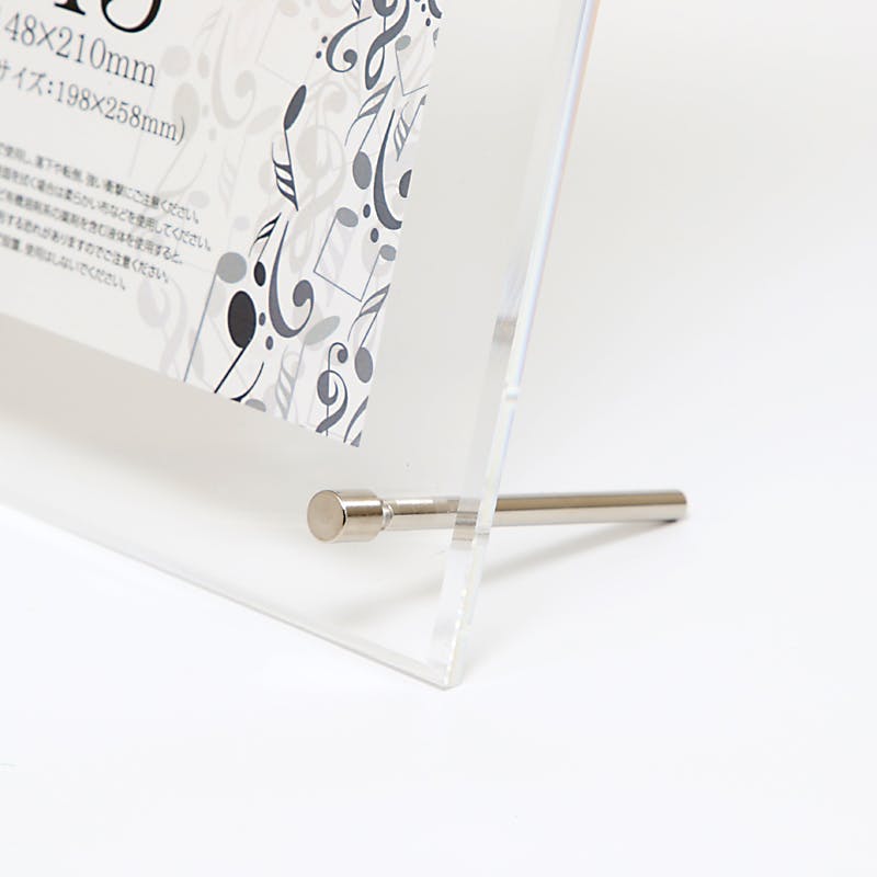 A5サイズ(148×210mm)がキレイに納まるアクリル製のサインフレームです。高透明度のアクリルを使用し、4辺を斜めにカットすることで高級感を演出しています。インテリアにもなじみやすいシンプルなデザインですのでオフィスやホテル・飲食店の受付等でもご使用いただけます。ビスの装着位置を変更することで縦置き・横置きが可能です。