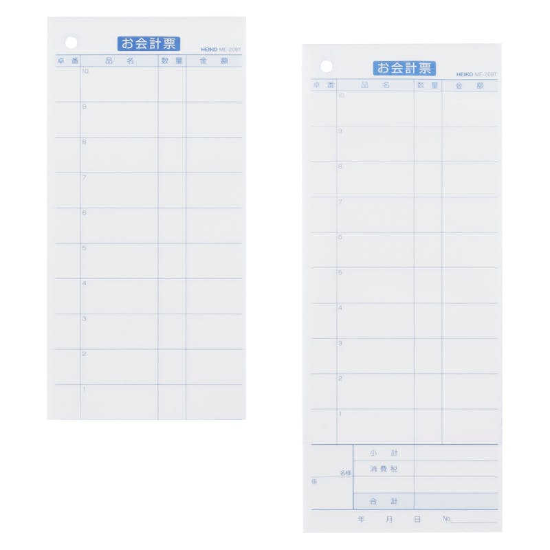 各行に切りやすいミシン目が付いたお会計票。居酒屋・中華料理店・焼き肉店など、追加注文の多いお店におススメです。外税・2枚複写50組10行。※1枚目はミシン目付き(10本)