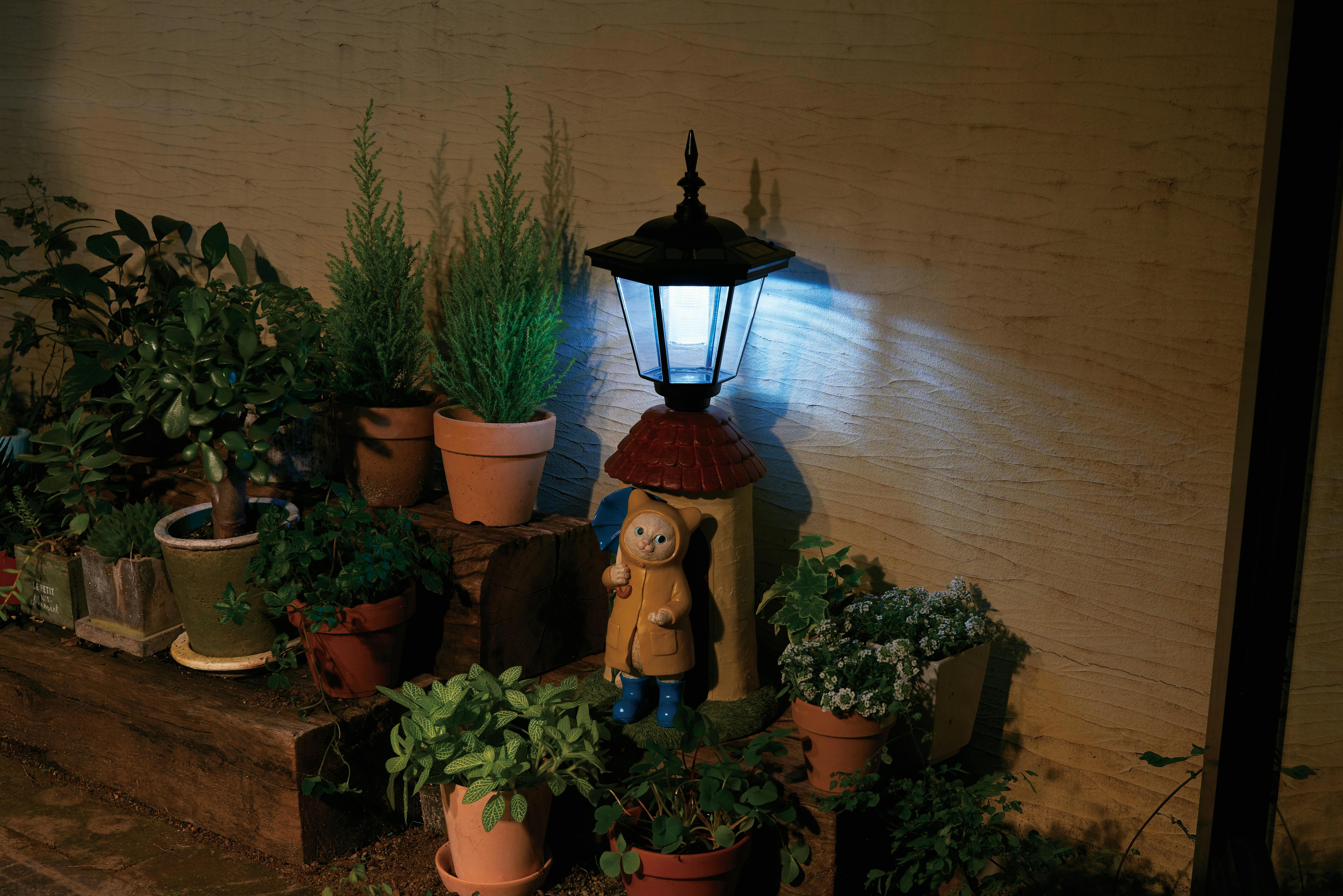 光センサー付き、防雨仕様、組立式本品はポリレジン製です。衝撃や強い力を加えると破損する恐れがありますので、お取り扱いには十分ご注意ください。長期間同じ場所に設置した場合、商品と接する床面に色褪せが生じる場合がありますのでご注意ください。風の強い日は、転倒する恐れがありますので、避難させてください。保証期間については、取り扱い説明書をご確認ください。