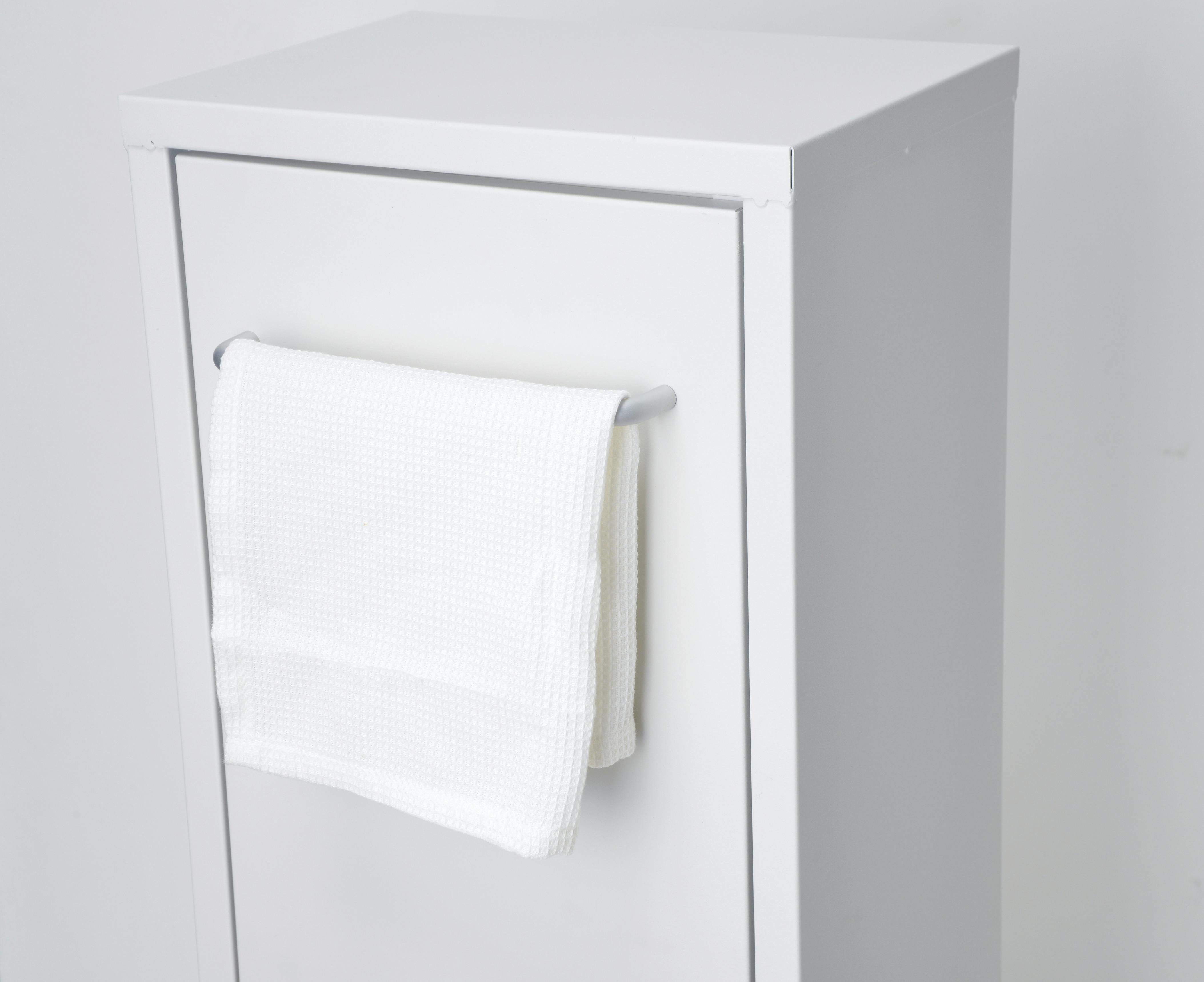 20リットルのゴミ袋がちょうど入るサイズ。キャスター付きなのでお掃除ラクラク(ロック付き)。ハンドルはタオルハンガーとしてもお使いいただけます。