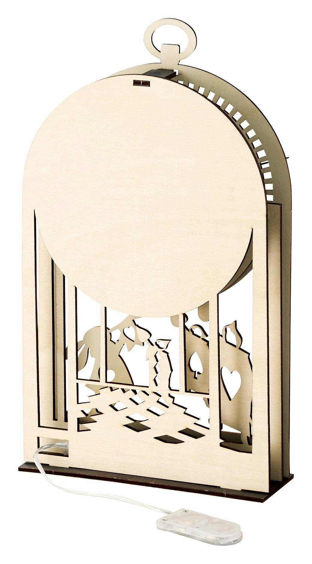 木製パズルを組み立てるとライト付のシャドウボックスに変身アリスの世界が広がります。