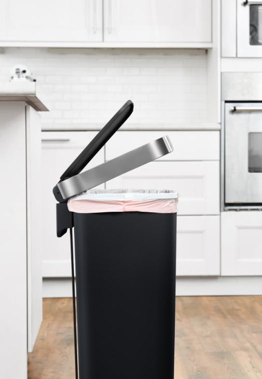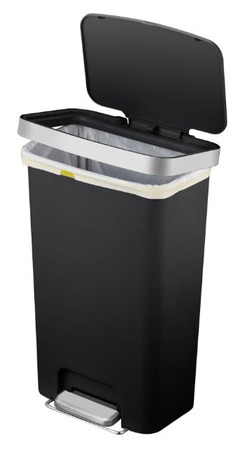 横型レクタングルサイズのステップ式ゴミ箱。フタシルバーふちのリム部分とフタを一緒に持ち上げると開放状態にできます。移動に便利な内蔵キャスター付き。