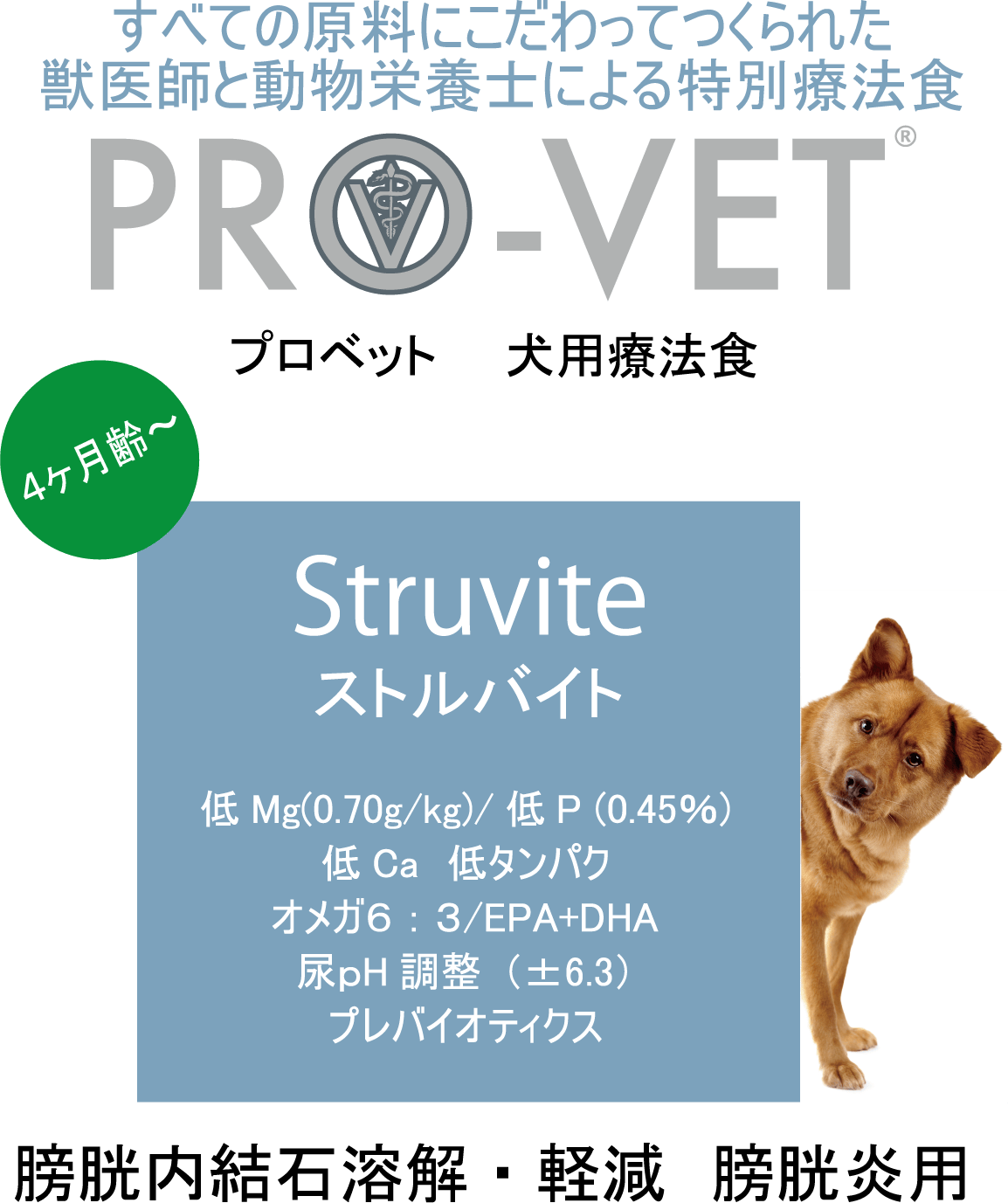 膀胱内の結晶や石を溶解し、症状の再発を防ぐ為の尿路結石用フードです。ストルバイトの成分 (マグネシウム、アンモニウム、リン酸塩) の尿中濃度を減らし、尿のpHを下げる事で、ストルバイト結石を溶解、新しい結晶を形成できにくくします。また、尿pHの平均値が6.3になるように、適切な尿酸性化剤を含んでいます。