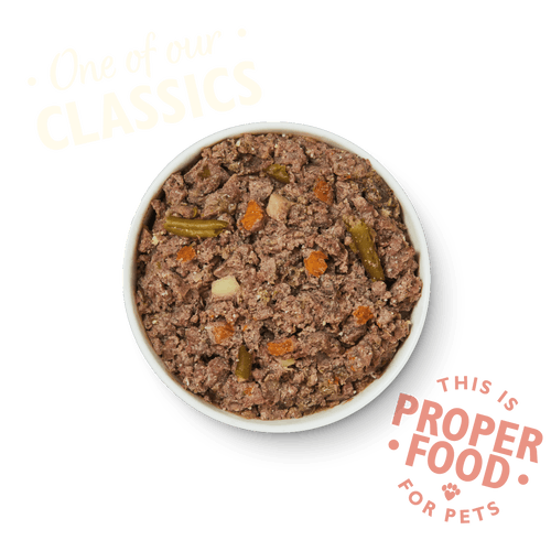 じゃがいも、にんじん、ブロッコリー、いんげん豆、りんご、そしてハーブを加え、愛犬がケンコウテキな食生活を送るために必要なビタミンとミネラルをすべて含んでいます。このレシピは穀物を使用していませんので、お米やその他の穀物に敏感な愛犬に最適です。