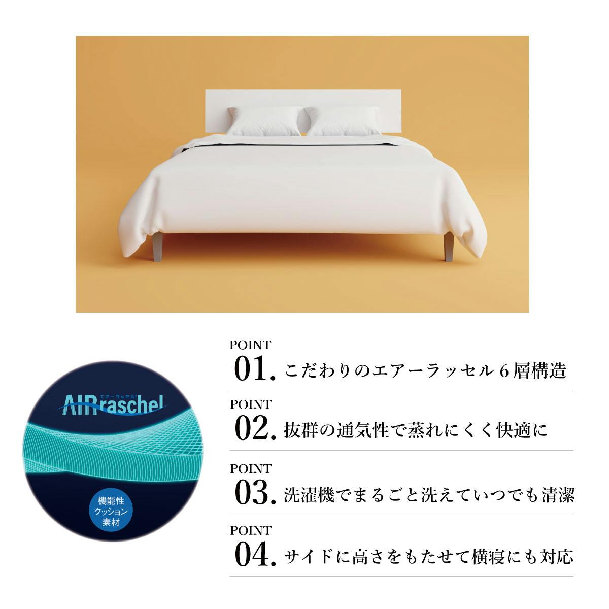 ソフトエアーラッセルを採用し、抜群の通気性を確保。ソフトエアーラッセル独自の柔らかな弾力性と反発力で、優しく頭部を支えます。
