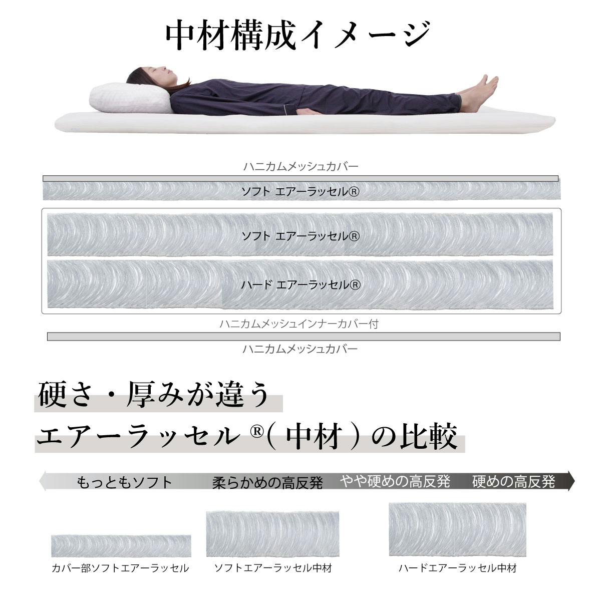 上下入れ替えることで体に合った柔らかさに調節できます。通気性の良い立体構造編物で余分な湿気を外に逃がして不快な熱や汗がこもりません。