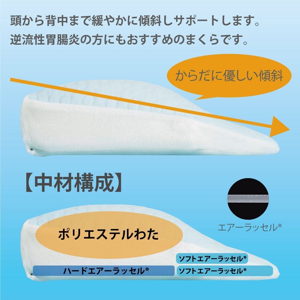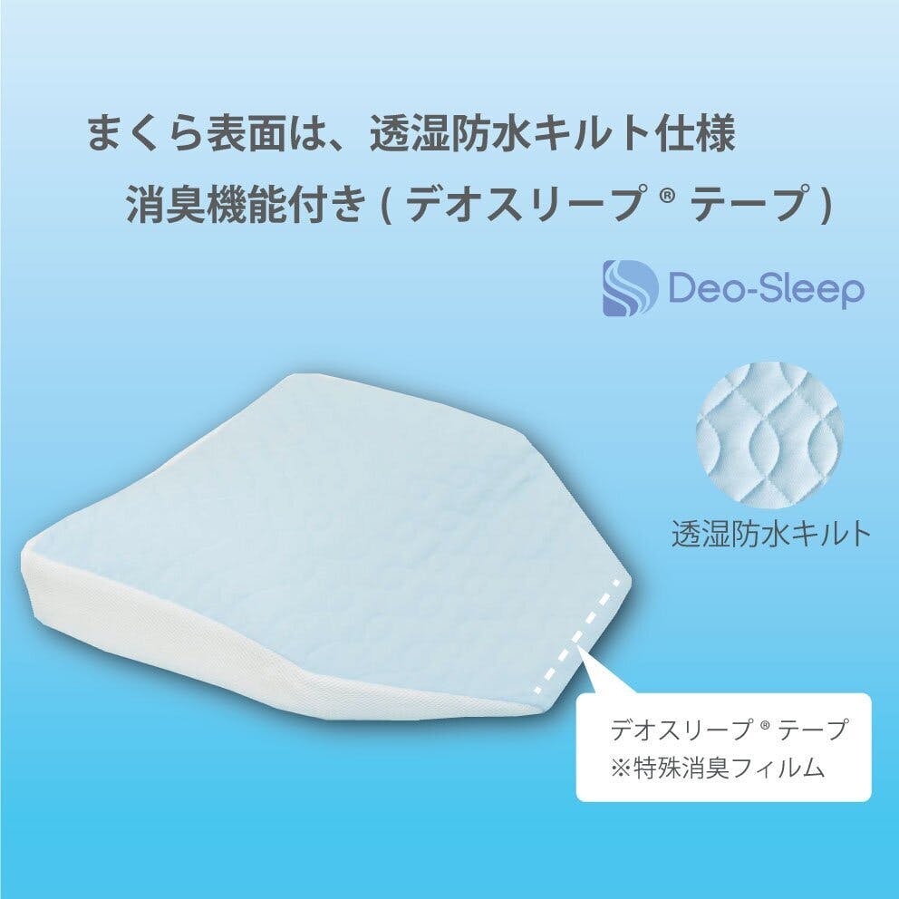 まくら表面は透湿防水キルト仕様。ソフトな感触で寝心地も快適なシニア向けまくらです。消臭機能付き(デオスリープ)中材:エアーラッセル、ポリエステルわた組成:ポリエステル100%